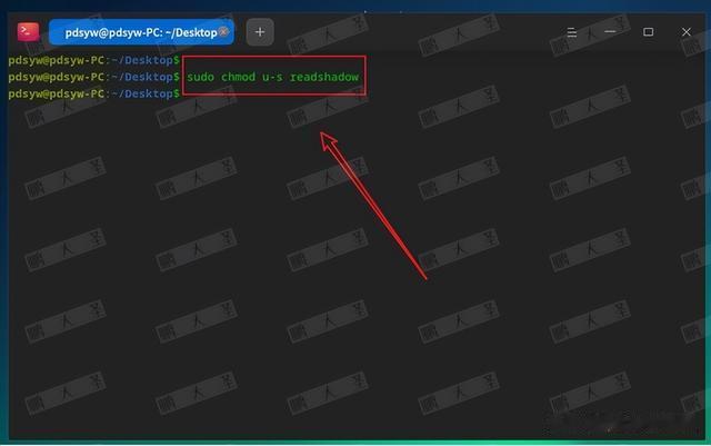 pdsyw@pdsyw-PC:~/Desktop$ sudo chmod u-s readshadow去掉 readshadow 的 SUID 位。