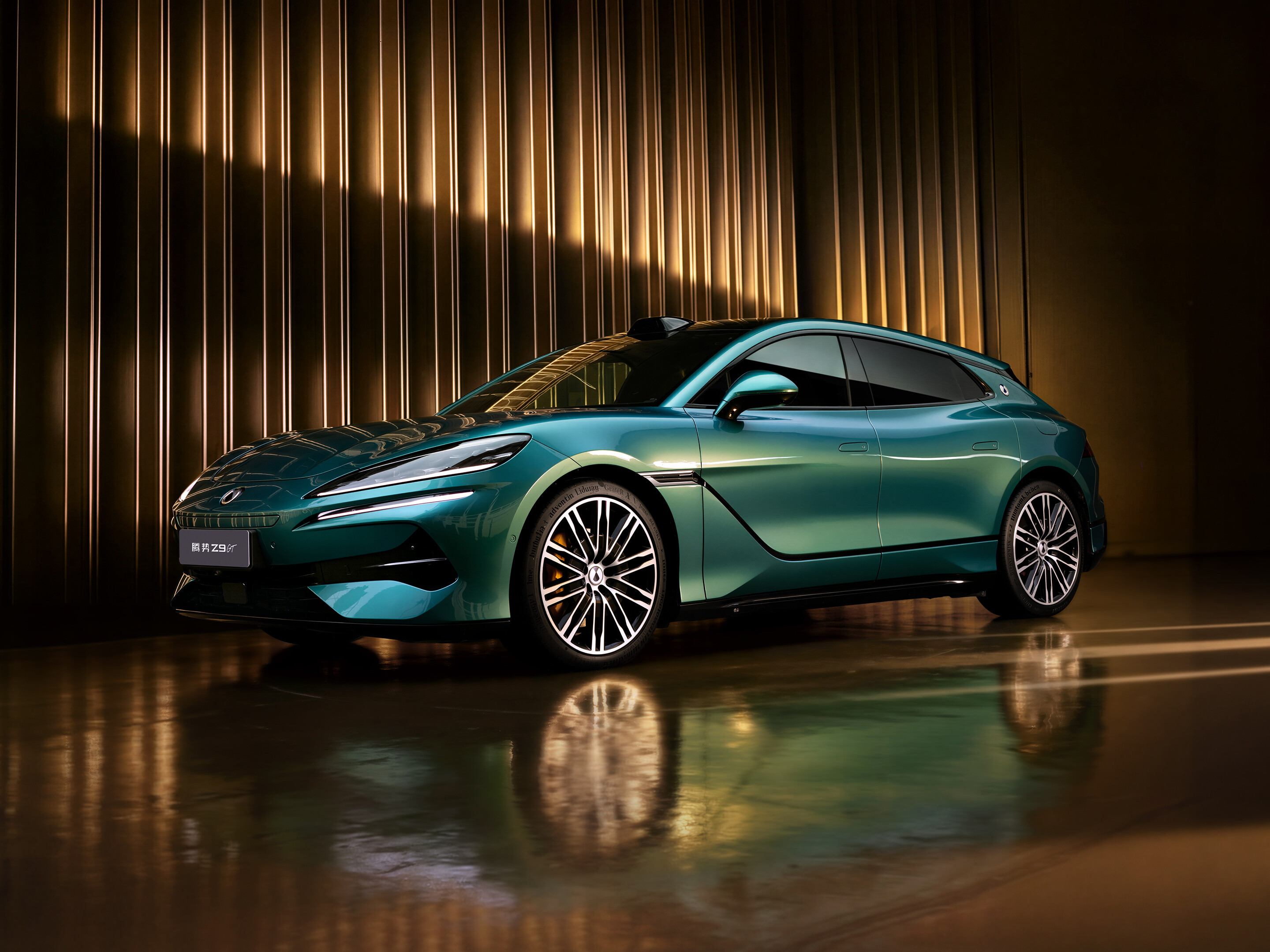 亮点一,猎装轿跑外观对于腾势Z9GT EV的外观设计而言,其猎装的外观设计可以说有着很高的辨识度,整车的车身姿态低趴,优雅之势的设计美学也较为突出,通过前脸部分的乘风双翼造型,配合大尺寸犀利大灯组以及两侧的夸张导流槽设计,让整个前脸部分看上去既显科技,同时也显运动和侵略性。
