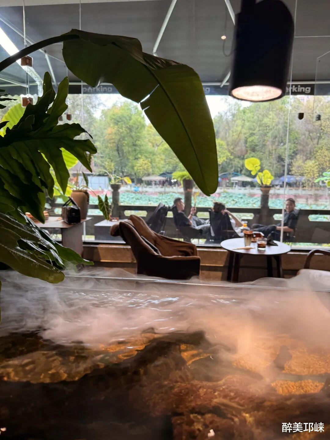 11月3日上午,小雨绵绵,邛崃瓮亭公园的Parking Coffee里,几位年轻人围坐窗前,手捧咖啡,目光投向窗外朦胧的湖光树影。粗犷的工业风材质与窗外柔和的自然景致形成有趣对比,却又和谐共存。
