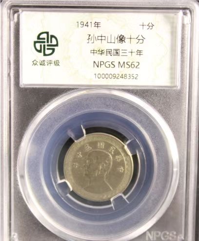 二、设计美学:传统与现代的货币对话正面:国父肖像的工艺呈现币面的孙中山侧面像雕刻细腻传神,先生神态庄重、轮廓清晰,将民国对国父的崇敬之情融入方寸之间。即便历经岁月,经众诚评级(NPGS)鉴定为 MS62的它,人像细节仍保存完好,可见当时机制币工艺的扎实水准。
