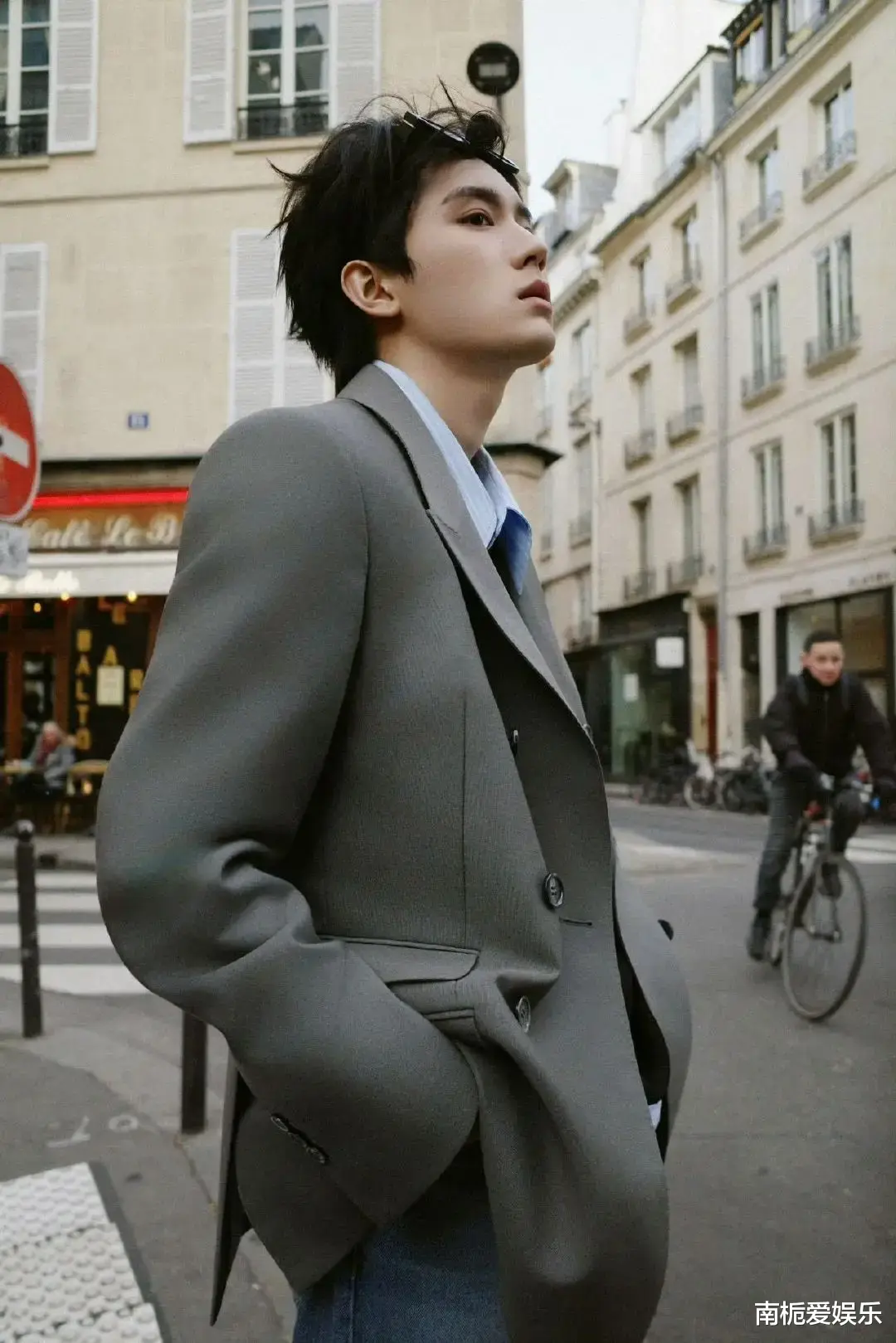造型的高潮部分来自其精心设计的法式叠穿搭配。周翊然身穿Ami Paris 2026春夏系列浅灰色双排扣西装,内搭蓝条纹衬衫与黑色针织背心,巧妙运用硬挺西装与柔软针织的材质对比,营造出丰富的视觉层次。下身搭配简约牛仔裤与经典德比鞋,既延续了法式慵懒美学,又不失现代都市感。整个造型在塞纳河晨光的映衬下更显质感,阳光轻抚其侧脸轮廓,倚栏凝望时眼神深邃,仿佛偶像剧男主角从荧幕中走出。