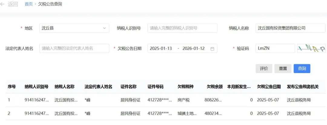 值得关注的是,近一年以来沈丘国投发生过欠税事件,公司资金压力凸显。国家税务总局电子税务局官网显示,2025年5月7日,沈丘县税务局披露,沈丘国投存在城镇土地使用税、房产税欠缴情形,两项欠税余额分别为48.02万元、80.82万元,合计欠税128.84万元。
