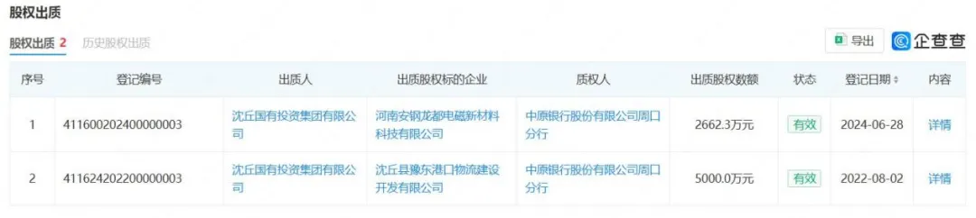 此外,沈丘国投存在股权出质的情况。企查查显示,沈丘国投先后于2022年8月、2024年6月将其持有的沈丘县豫东港口物流建设开发有限公司5000.0万元的股权、河南安钢龙都电磁新材料科技有限公司2662.3万元的股权出质给中原银行股份有限公司周口分行。