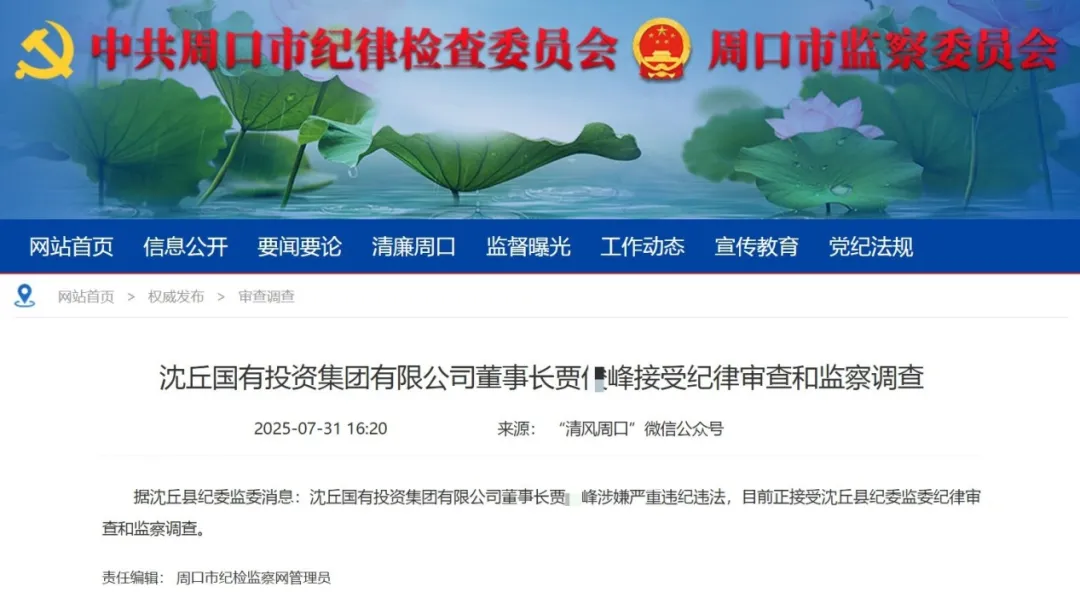 2025年7月31日,周口市纪检监察网站显示,据沈丘县纪委监委消息:沈丘国有投资集团有限公司董事长贾某峰涉嫌严重违纪违法,目前正接受沈丘县纪委监委纪律审查和监察调查。信息来源于“清风周口”微信公众号,而该微信公众号是中共周口市纪委、周口市监察委员会官方公众平台。