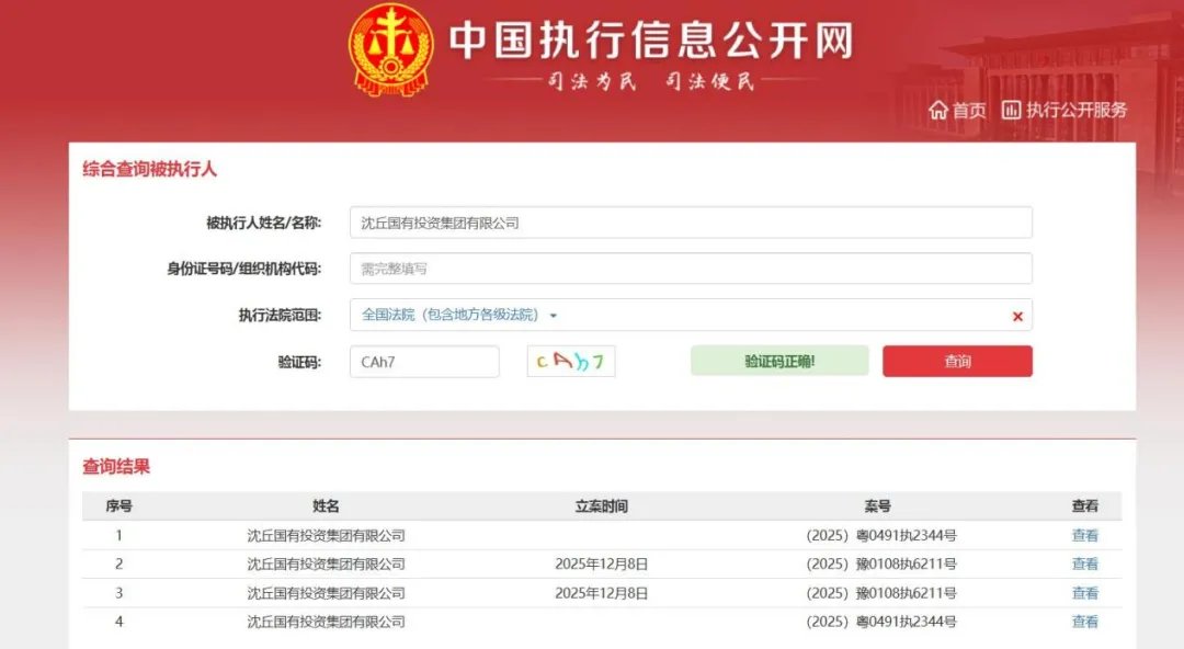 同时,沈丘国投司法风险也在上升。截至2026年1月12日,中国执行信息公开网和企查查数据显示,沈丘国投有2条被执行人记录,被执行总金额高达4298.99万元。具体来看,2025年10月16日,珠海横琴新区人民法院将沈丘国投纳入被执行人名单,案号为(2025)粤0491执2344号;2025年12月8日,郑州市惠济区人民法院将沈丘国投纳入被执行人名单,案号为(2025)豫0108执6211号。