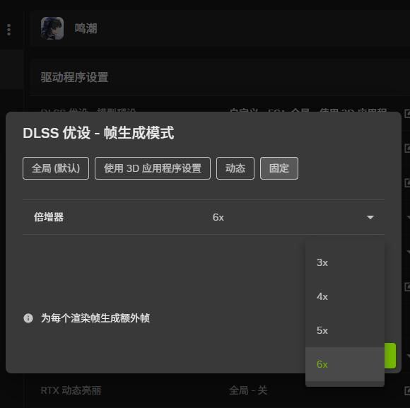 在所有支持DLSS多帧生成的游戏中,用户都可以启用4倍多帧生成,而在使用最新FrameGeneration .dll 的部分游戏中,用户可以选择高达6倍的倍数。比如,《鸣潮》游戏2.6版本起支持DLSS4(4倍帧),2026年3月随NVIDIA驱动更新至DLSS4.5,解锁5倍、6倍帧生成。