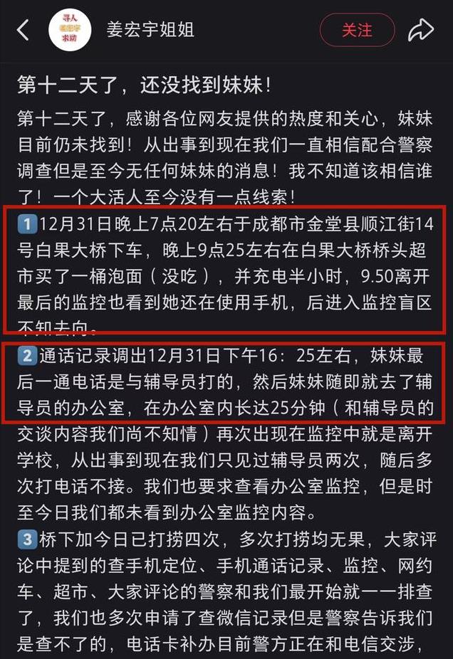 12月31日下午,姜宏宇最后一次出现在学校白果大桥附近的超市监控中。当时,她神态自然,购买了泡面,还为手机充电,没有表现出任何轻生迹象。然而,令人不解的是,她随后便与家人失联,手机关机,彻底失去踪迹。