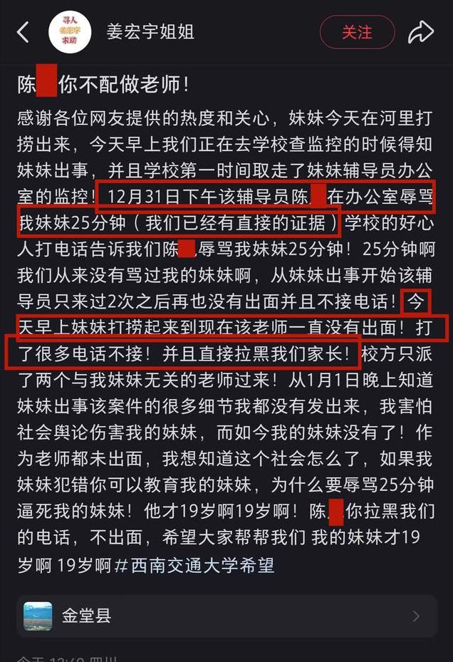 “一个年轻的生命消失在白果大桥旁,她到底经历了什么?”2024年12月31日,西南交通大学希望学院的女大学生姜宏宇离奇失联,12天后,她被证实身亡。失踪前,她曾接到辅导员的电话并在办公室逗留25分钟。家属控诉辅导员辱骂并隐瞒细节,舆论一片哗然:“校园究竟是安全港,还是隐秘伤害的起点?”