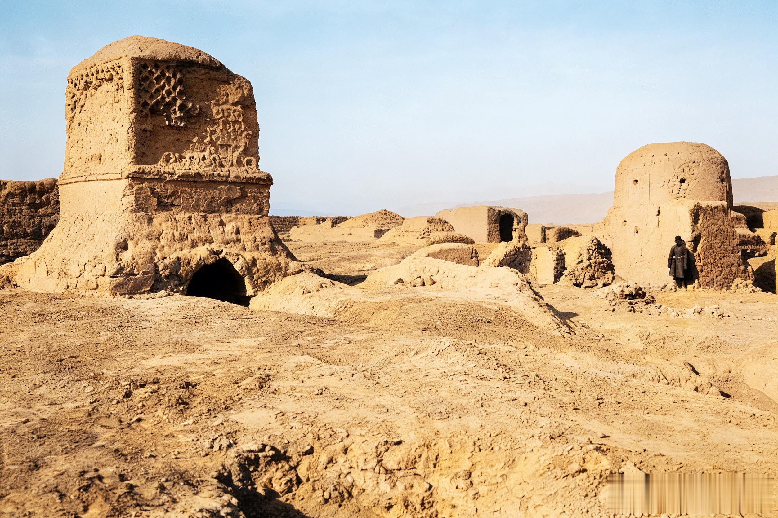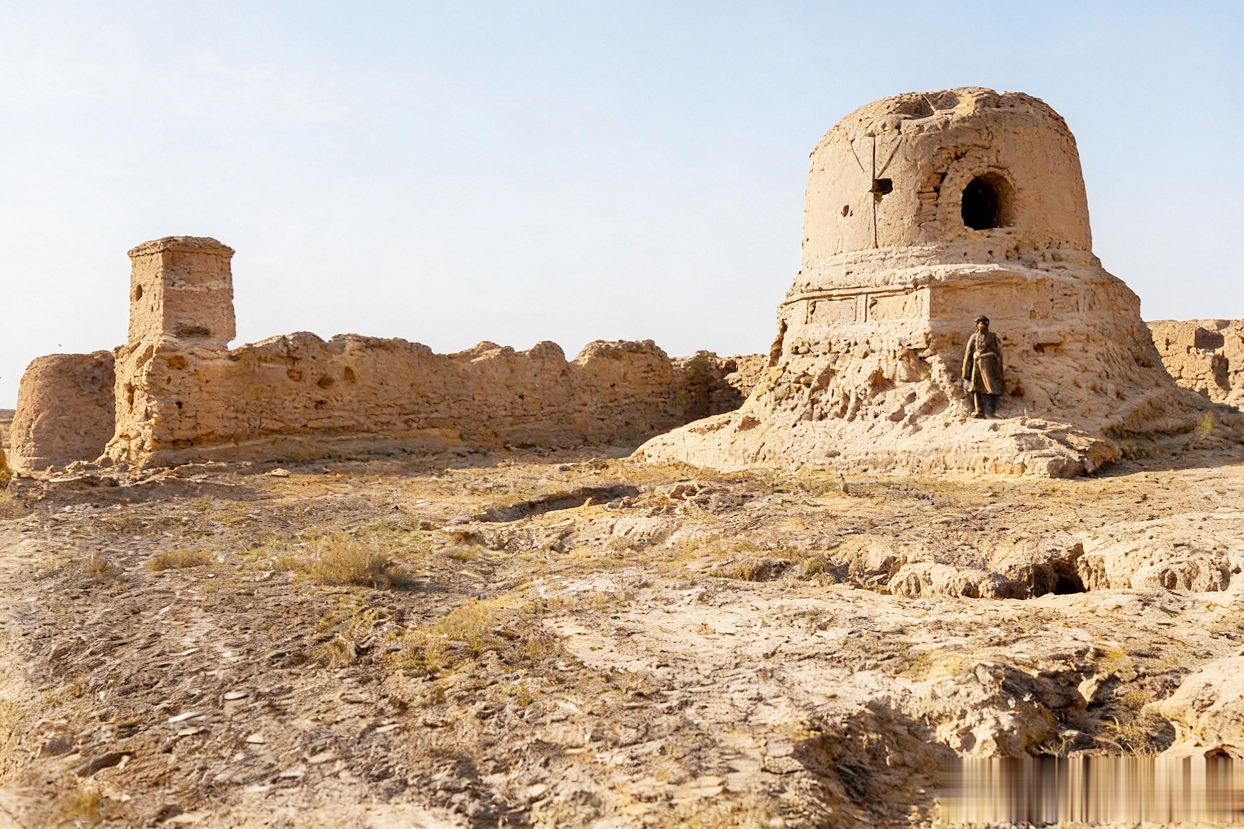 可汗堡内的部分建筑,左侧建筑上层的墙体上还残留有繁复的纹饰。在画面右侧,有一名男子站在穹顶的圆形建筑下。