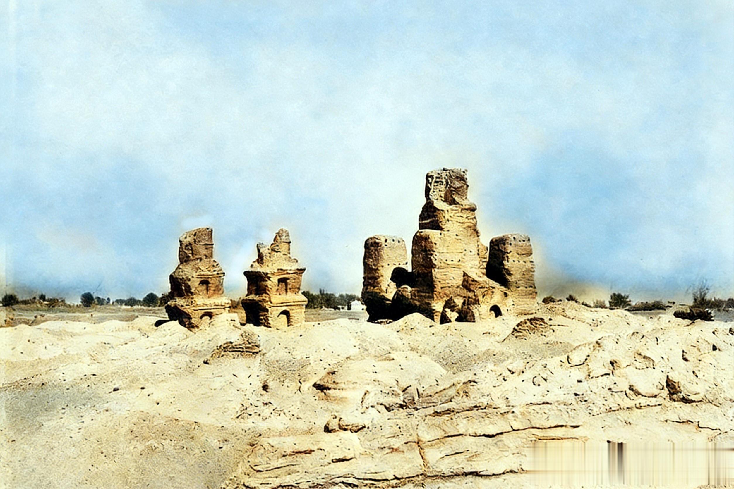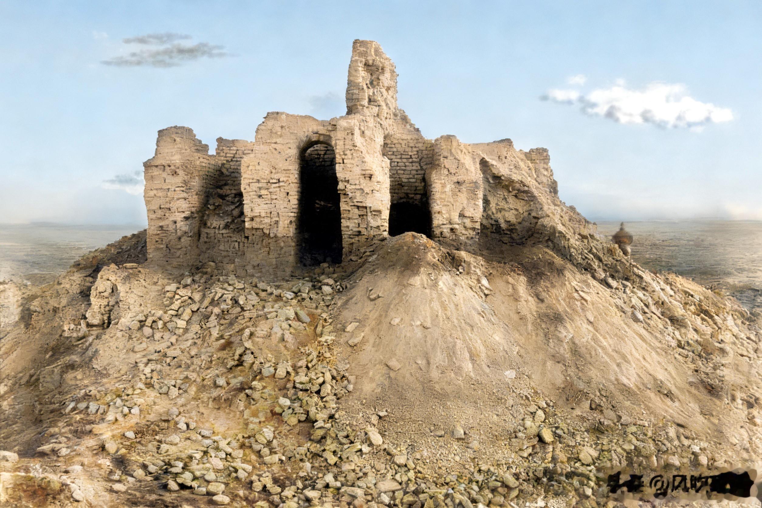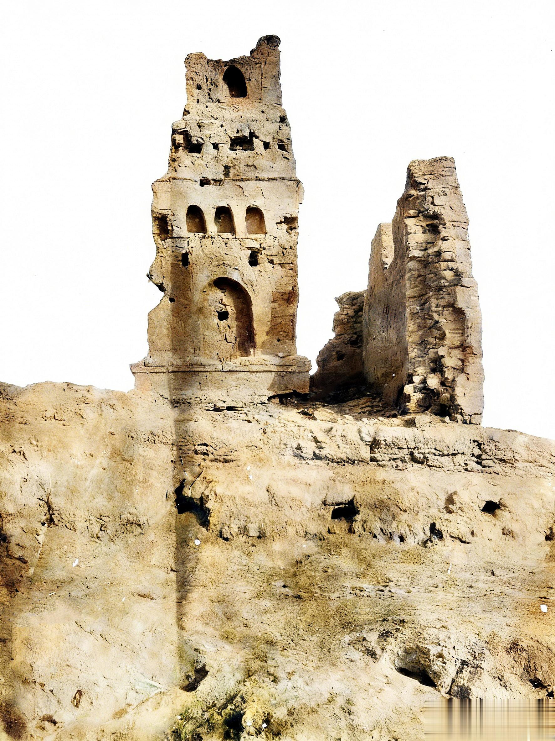 位于可汗城内的一座塔楼,外墙面上分布着供奉佛像的大小拱券形壁龛。这种建筑风格是高昌佛教鼎盛时期的典型代表。