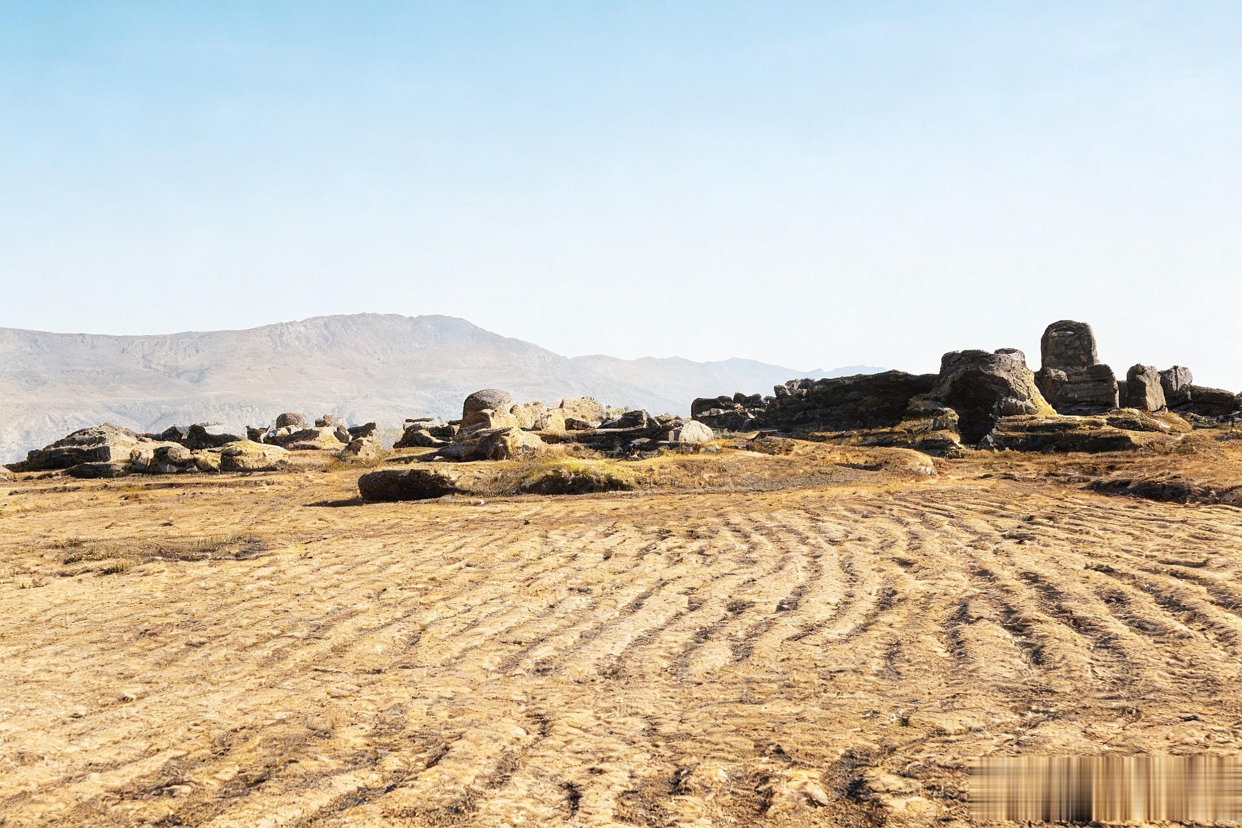 从远处眺望高昌故城的全貌,残存的建筑高低起伏,鳞次栉比。前景大片土地为屯田区,明显有开垦过的痕迹。