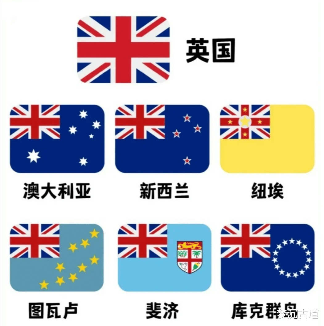 其他几面旗帜的左上角都是英国国旗,体现这些国家与英国的历史渊源,这些国家都是前英国殖民地,还有很多前英殖民地是这样的旗帜。