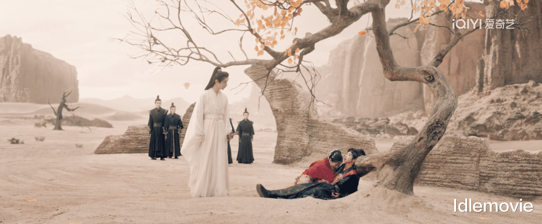 画面中有了枯藤老树落叶,素衣冷色荒漠的情景交融,成毅眼中含泪,声音颤抖,由画面边缘走到中间。