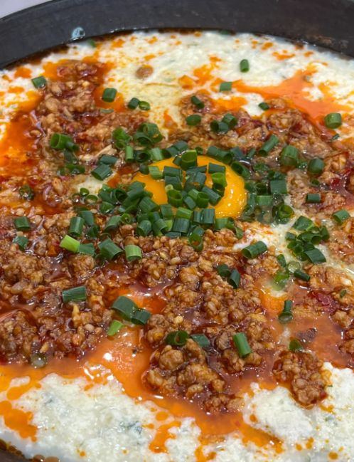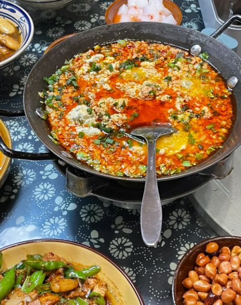 煮到合渣变得浓稠、豆腥味完全散去的时候,加入切碎的青菜。恩施人常用萝卜菜叶、小白菜或者南瓜叶,洗净切碎后放进锅里,再煮五分钟。最后加盐调味,淋上一勺土家特有的油辣子,撒点葱花,一锅热气腾腾的合渣就做好了。合渣本身味道清淡,全靠油辣子提味,辣中带着豆香和菜香,吃起来绵软顺滑,非常下饭。