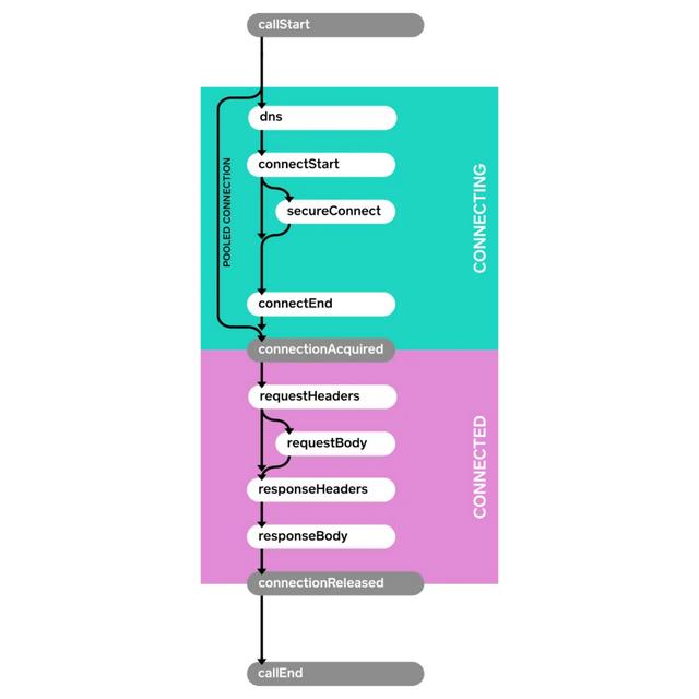 对于Android,系统网络框架OkHttp支持添加EventListener来获取Http请求的状态流转信息,可以在各状态回调内记录时间戳来计算RTT,详细信息见附录2,单次请求的Events定义如下图: