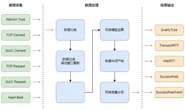 携程弱网识别模型的整个工作流程由数据采集、数据处理、结果输出三部分组成,接下来我们顺着流程来逐个剖析相关细节。