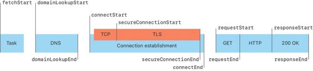 对于iOS,iOS 10之后NSURLSession支持通过NSURLSessionTaskDelegate的协议方法URLSession:task:didFinishCollectingMetrics:获取到请求的Metric信息,详细信息见附录1,单次请求的Metric定义如下图:
