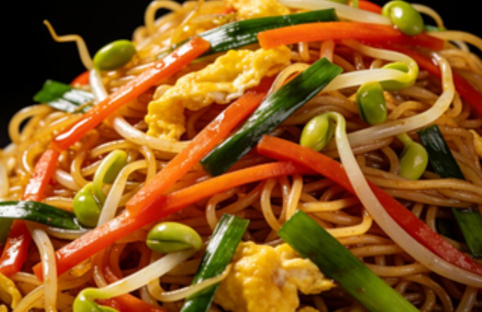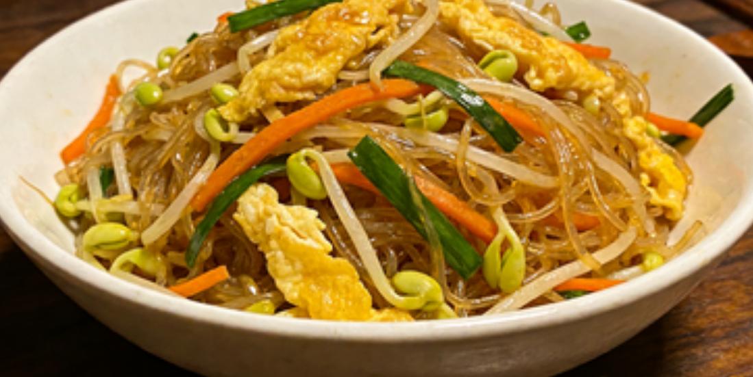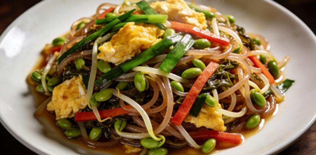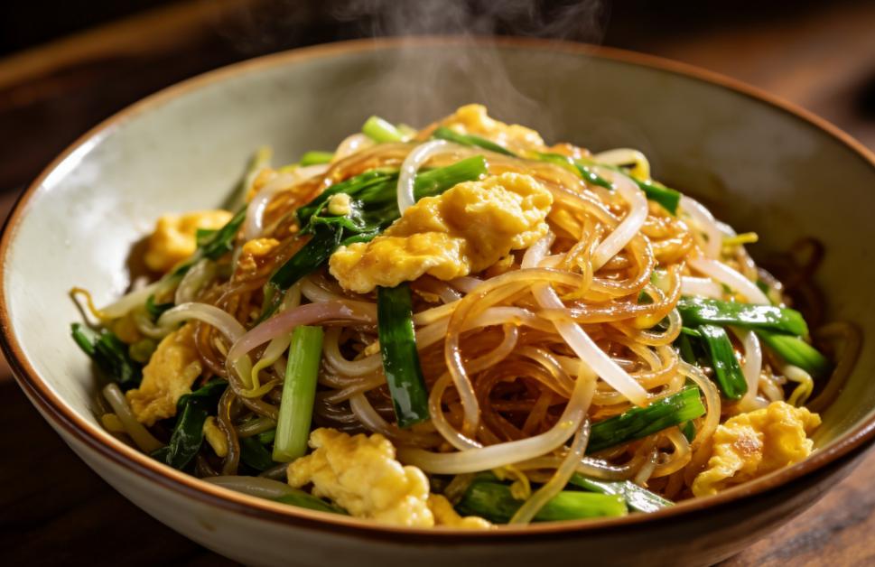 翻炒豆芽的间隙,舀一勺黄豆酱,酱香醇厚不咸齁,再淋少许生抽和米醋提鲜,醋要沿着锅边淋,高温激发出蒜香,却不留下明显醋味。此时倒入泡好的粉条,手腕用力颠锅,粉条在锅中翻滚,均匀裹上酱汁,再加入韭菜段和炒好的蛋花,翻炒三五下就关火 —— 韭菜不能炒老,要保持翠绿的颜色和脆嫩的口感,这是炒合菜的灵魂。