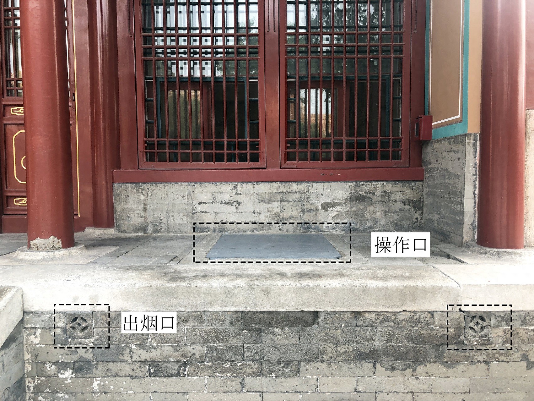 皇宫内的众多宫殿的墙壁许多其实是砌成空心的“夹墙”,墙下则挖有火道,添火的炭口就位于宫殿外的廊檐下。