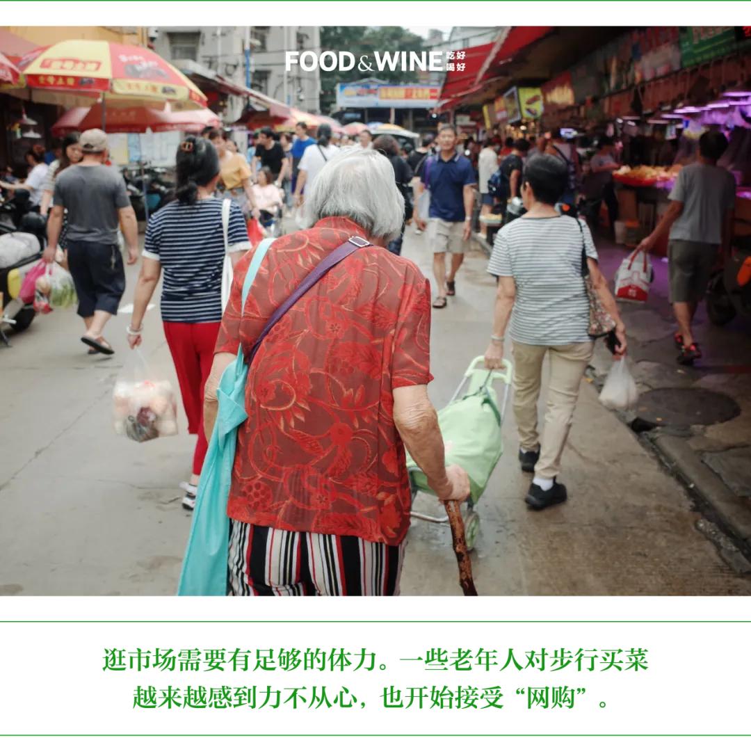 同样是沙园市场的拥趸,70 多岁的池先生和上述年轻人一样,并没有把肉菜市场当成唯一的购物渠道。池先生退休后和众多老同事一起,每天到沙园市场「赶集」。他保持老工人的作风,每天 9~10 时出发,步行来回,全程 1 小时左右,买菜和散步合二为一。随着年龄越来越大,他对步行买菜这项工作越来越感到力不从心,于是渐渐有了新选择。「一两年前开始网购,以前不知道,后来儿媳告诉我有这个渠道。有一个博主耐心地教我(社区网购),而且家所在的社区就有提货点,慢慢就习惯了网购。社区团购只是买水果、百货、早餐。现在已经很少去沙园市场买菜。」他说。