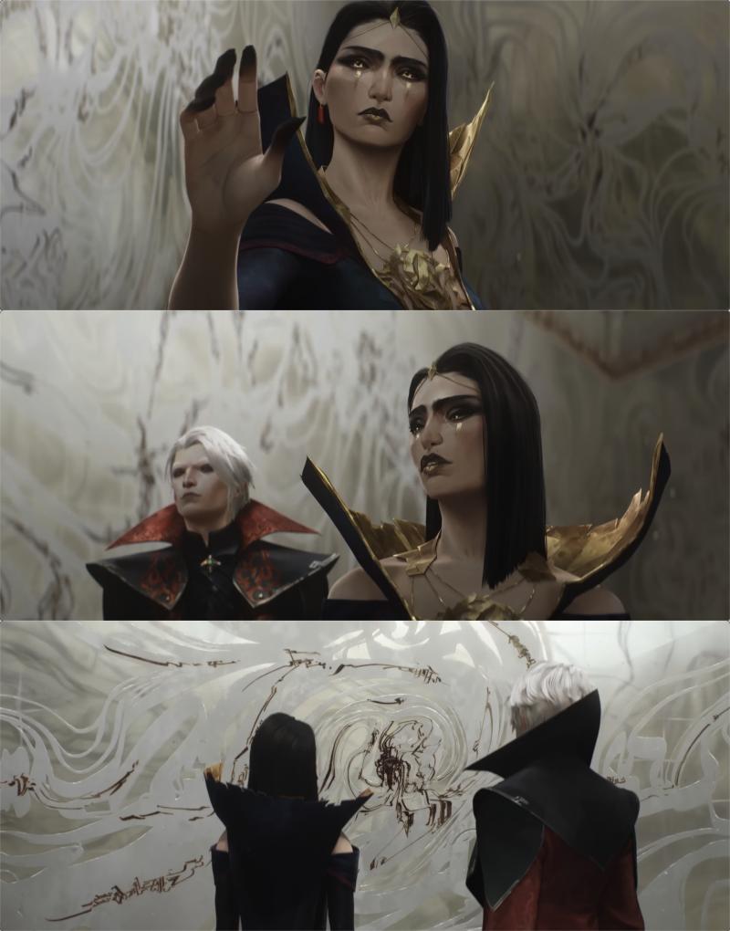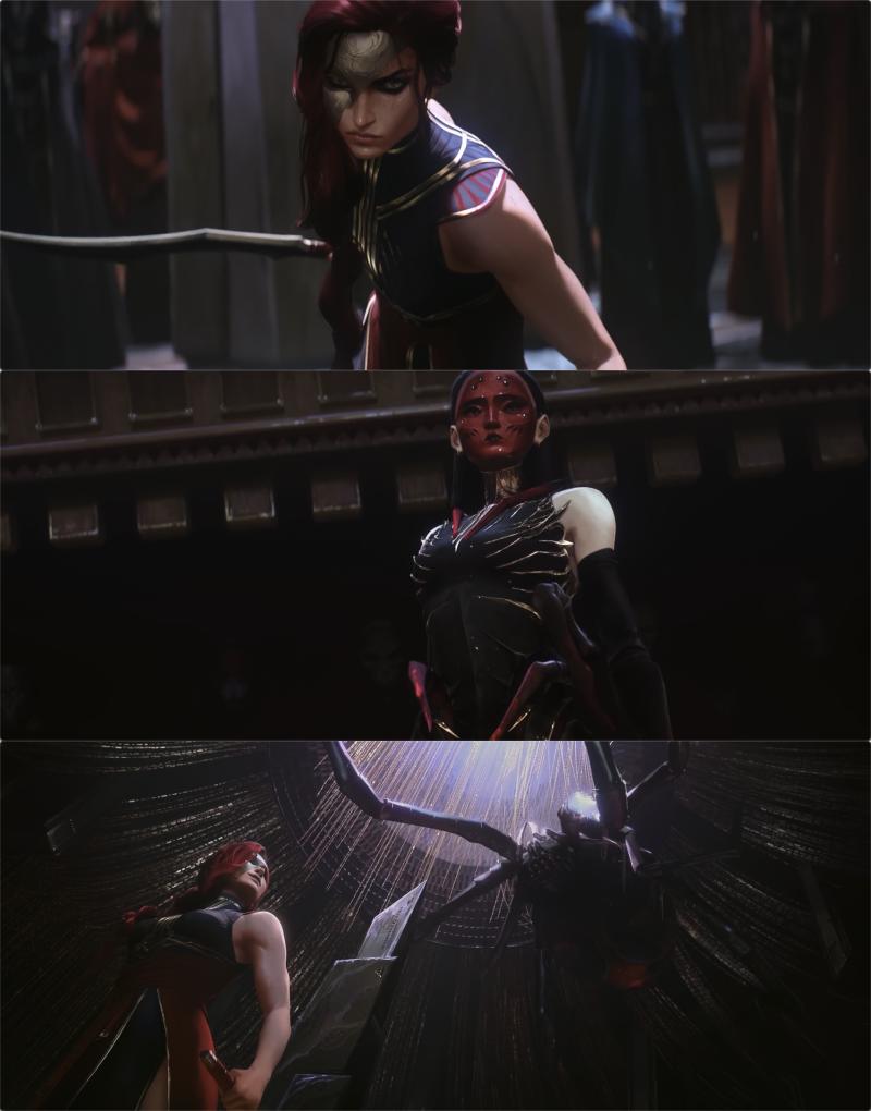 之后梅尔的故事线与诺克萨斯神秘的组织黑玫瑰展开交织,而在《齿痕》这部短片中,故事线紧接双城之战,讲述了梅尔回到诺克萨斯,并且通过自己的特殊能力,预知到了诺克萨斯以及黑玫瑰组织即将发生的一些事情。