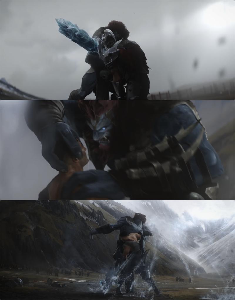 最后就是诺克萨斯与北境弗雷尔卓德野蛮人部族的战争,诺克萨斯一直在向外扩张,德莱厄斯作为诺克萨斯之手自然也是先锋官之一,根据英雄联盟宇宙的记载,德莱厄斯受命征讨巨魔部族,影片中呈现的就是诺手和特朗德尔战前1V1的画面,巨魔这家伙显然有点轻敌了,另外巨魔的武器【碎骨棒】也颇有来历,是冰女巫所赠。