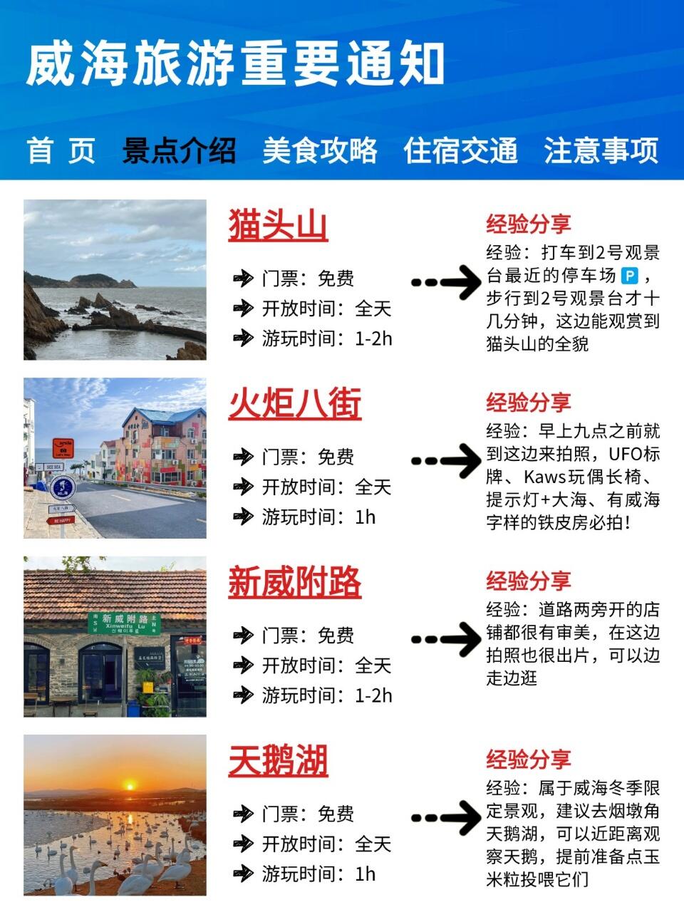 ☀️猫头山:打车到2号观景台最近的停车场🅿️,步行到2号观景台才十几分钟,运动量也不是很大,这边能观赏到猫头山的全貌☀️火炬八街:早上九点之前就到这边来拍照,UFO标牌、Kaws玩偶长椅、提示灯+大海、有威海字样的铁皮房必拍!