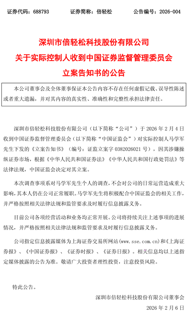 2月6日,倍轻松披露公告称,2月4日收到中国证监会对实控人马学军下发的《立案告知书》,因其涉嫌操纵证券市场,根据相关法律法规,中国证监会决定对其立案。