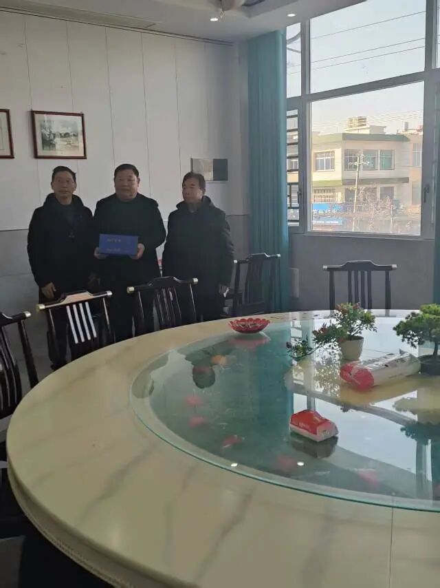 红安邹氏宗亲邹元国会长(左)向豫南邹氏宗族理事会捐赠《邹氏族谱》并与邹坤会长(中)、邹庆伟秘书长合影
