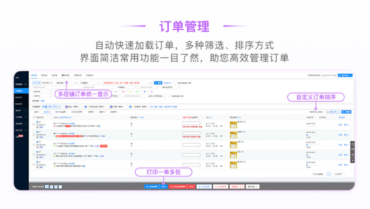 支持菜鸟电子面单,多平台批量打印与发货,面单共享、派送范围提示、自动合单,具备评价管理、售后提示等辅助功能。