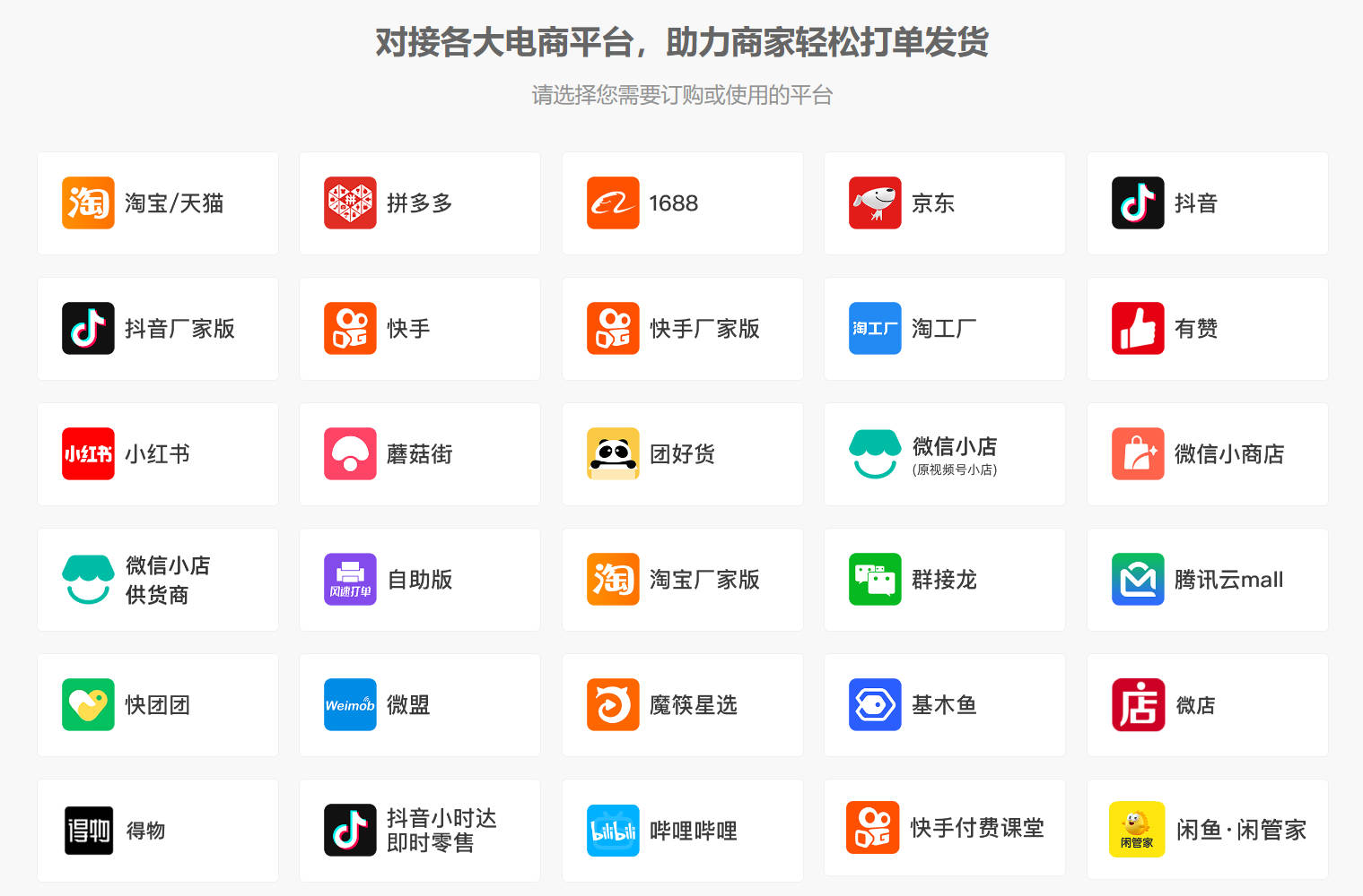 作为货源平台,1688的下游商户常分布于淘宝、拼多多、抖音等各类电商平台。因此,其打单软件需具备跨平台订单管理能力。例如【风速打单】,可对接超过30个电商平台,实现统一打单发货。