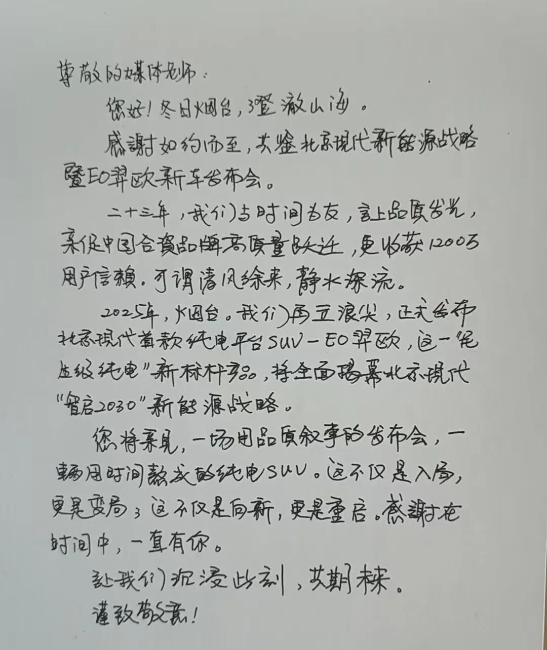 “与时光为友,让品质发光!”——当我从南端的深圳,一袭疲惫,抵达冬日烟台时,在我房间的桌上摆着北京现代公关部亲笔写的这样一段话:“二十三年,我们与时光为友,让品质发光,亲促中国合资品牌高质量跃迁,更收获1200万用户信赖,可谓清风徐来,静水深流。”这段话,深深打动了我,以至于当晚EO 羿欧上市及北京现代战略发布会整整两个多小时,我一直带着一股暖意、一丝温情沉浸在这家传统合资车企久违的品牌叙事中。