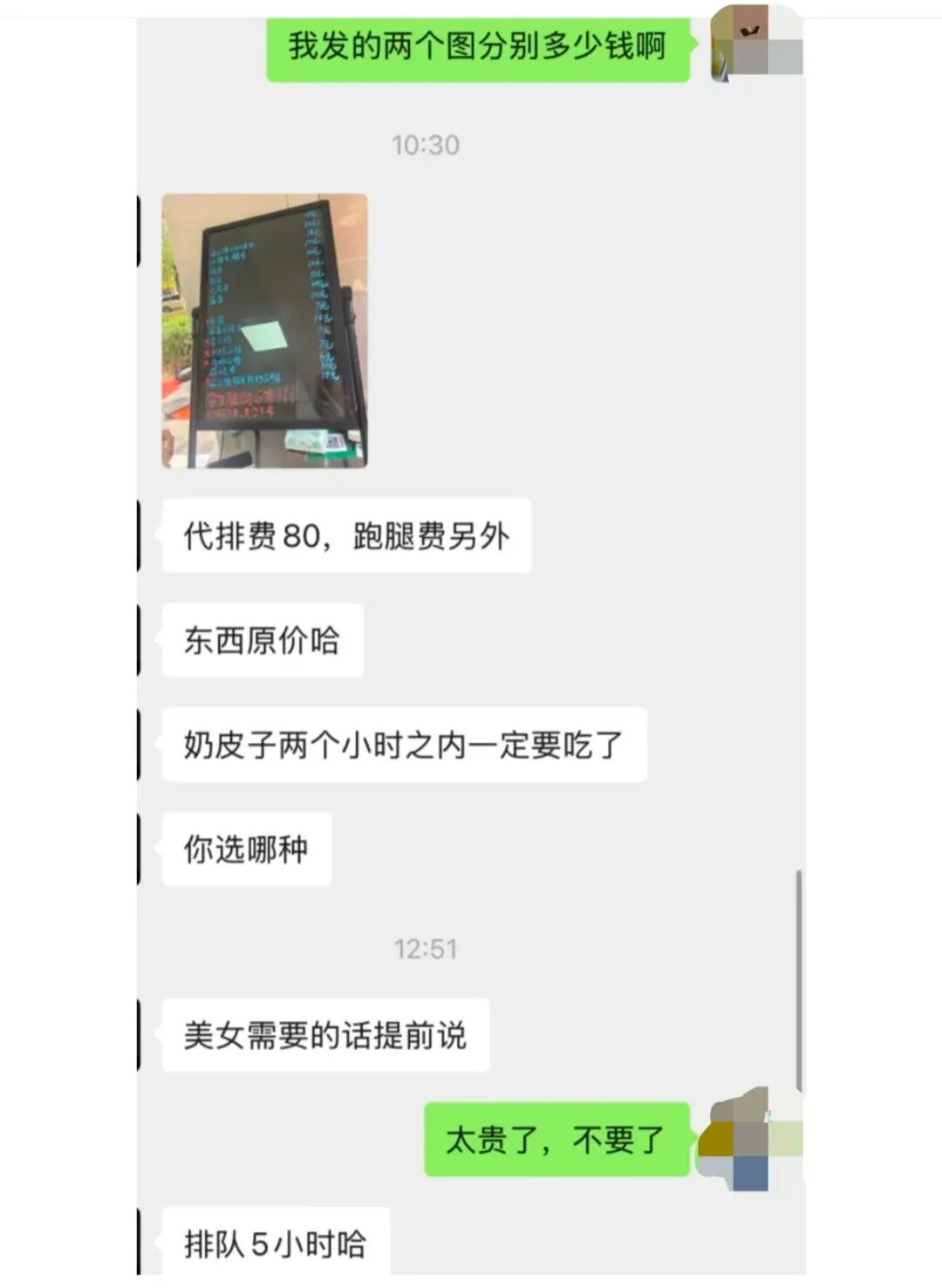 在社交平台,吐槽奶皮子糖葫芦排队难、价格贵的网友也开始增多。据一位南京网友发帖称,有黄牛出价140元“代购”奶皮子糖葫芦,包含80元代排费、60元跑腿费,糖葫芦价格另算。“代购”价格之所以如此高,是因为排队要花5个小时。