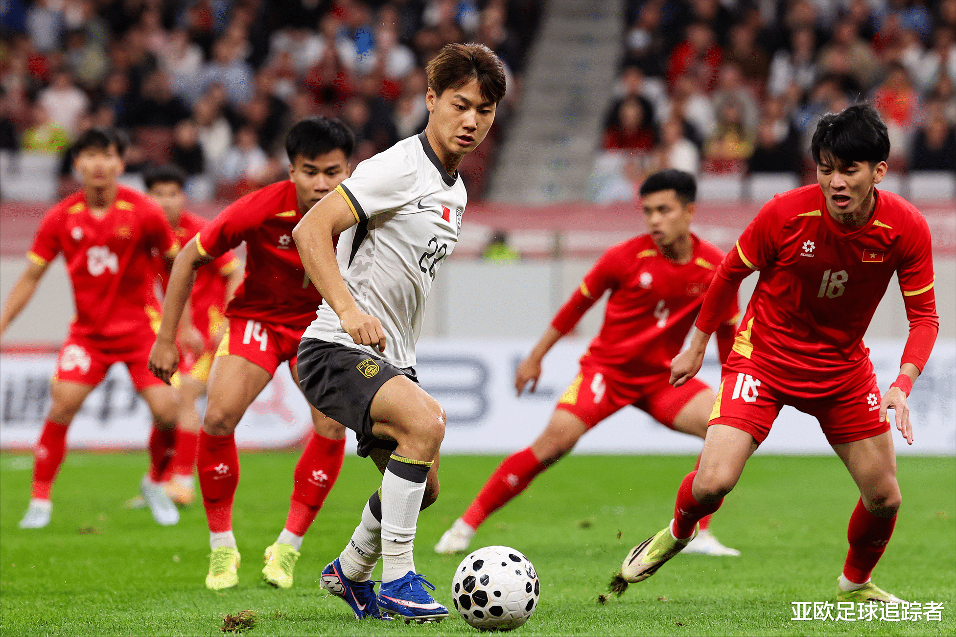 比赛第33分钟,越南队后场出现失误,毛伟杰得球后远射打高。
