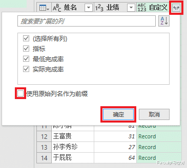 4. 扩展开“自定义”列,选中所有列。