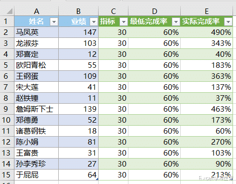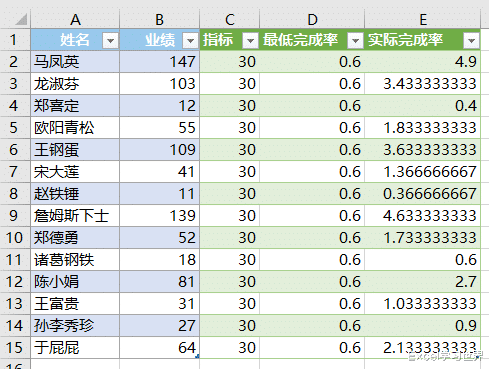 [指标=30, 最低完成率=0.6, 实际完成率=[业绩]/30]