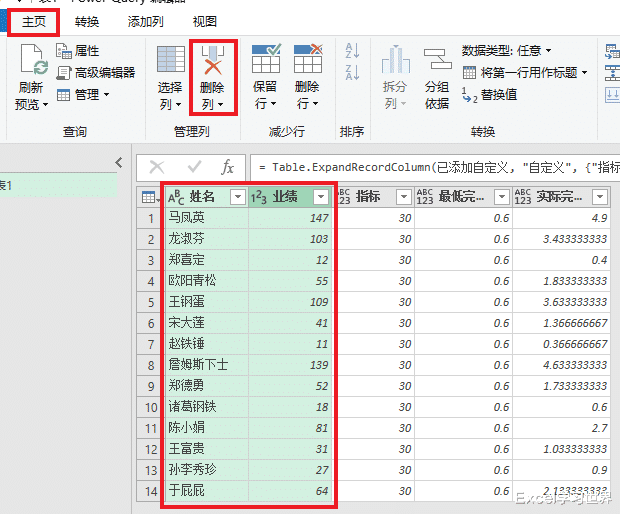5. 删除“姓名”和“业绩”列。
