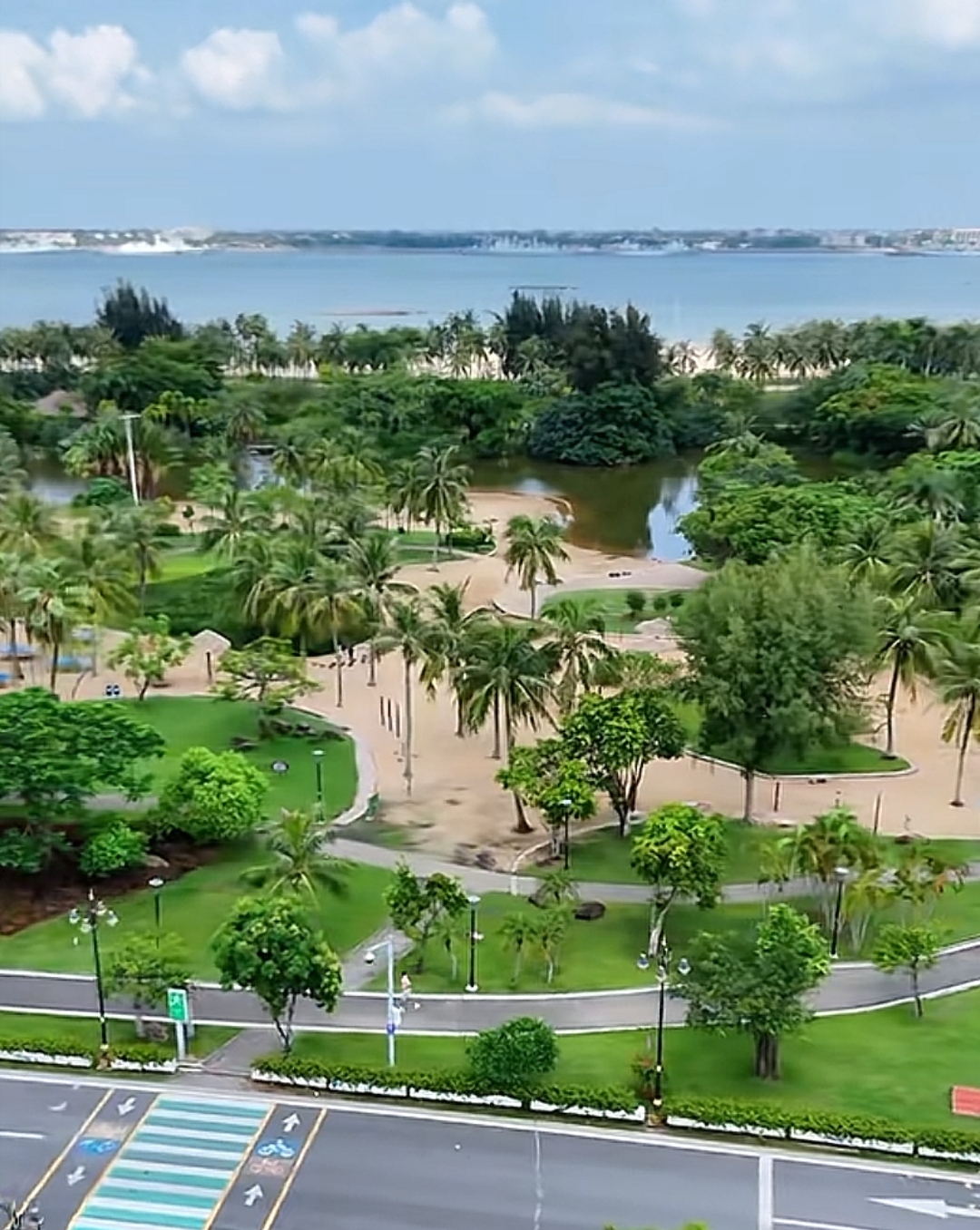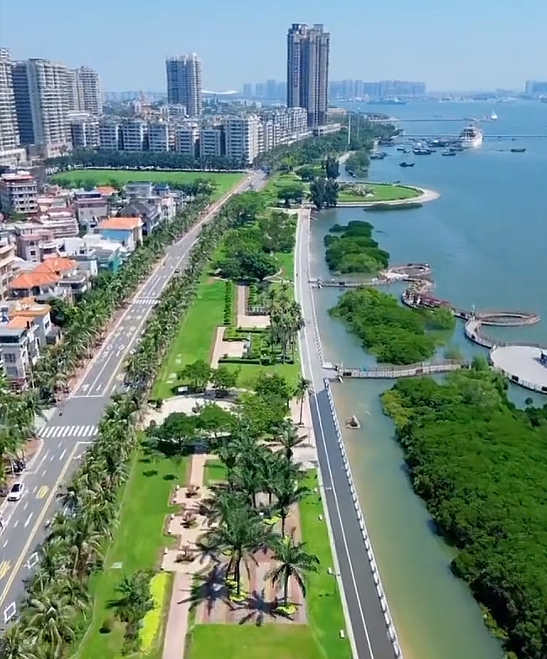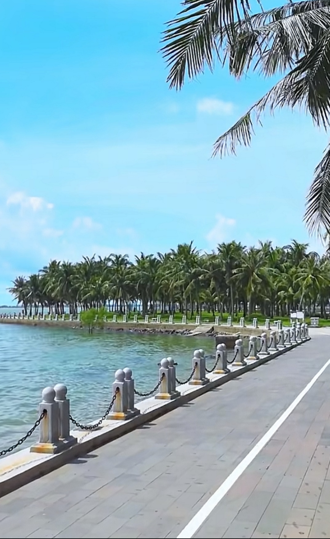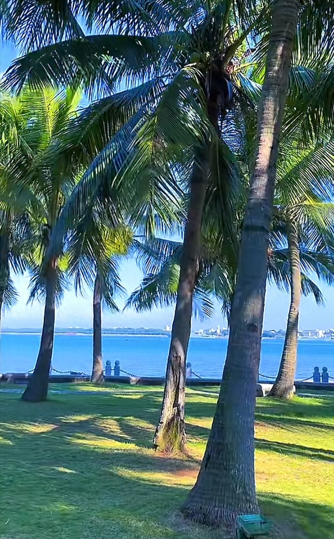 海湾旁的观海长廊公园,则别有一番幽静。这里种着许许多多的榕树和棕榈树,一棵棵大树像撑开的绿绒大伞,树叶密不透风,既能遮太阳,也能挡风雨。树下摆着石凳,每逢休息的日子,总坐满了乘凉、聊天的人。老人们摇着蒲扇,孩子们在树荫下追逐,时光在这里慢了下来。