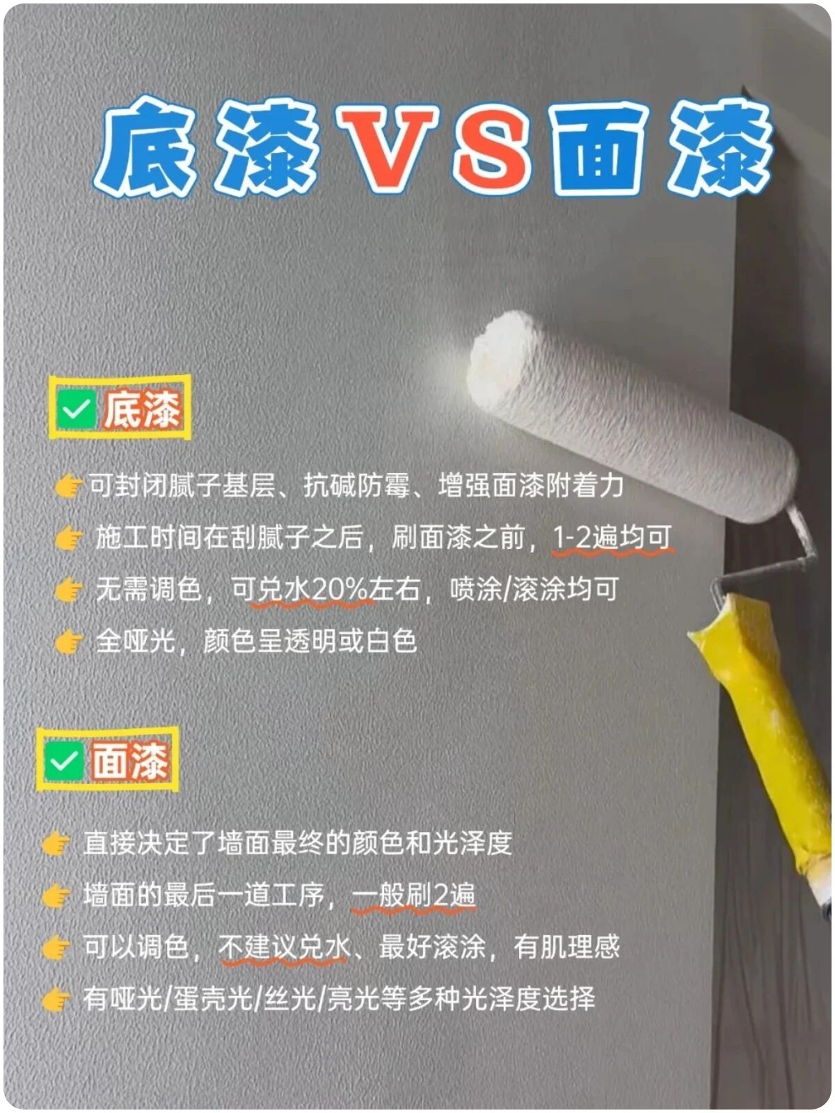 ▲由于油漆少加或不加水,面漆用量就会多点,所以需要额外增加一桶,也是正常合理的;好底漆才是完美墙面的第一步!说不用底漆都是想省钱的,底漆大概200元左右一桶,何必增加后期面层不均匀脱落的风险呢?总结:想刷出肌理感漆面,只需额外购买一个滚筒+一桶底漆+一桶面漆,费用多花600元左右;在面漆厚的情况下,墙面有点污渍,毛巾沾水直接擦问题不大的,所以个人觉得是很值得投入的。