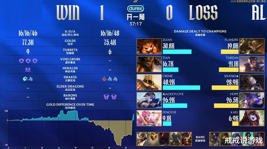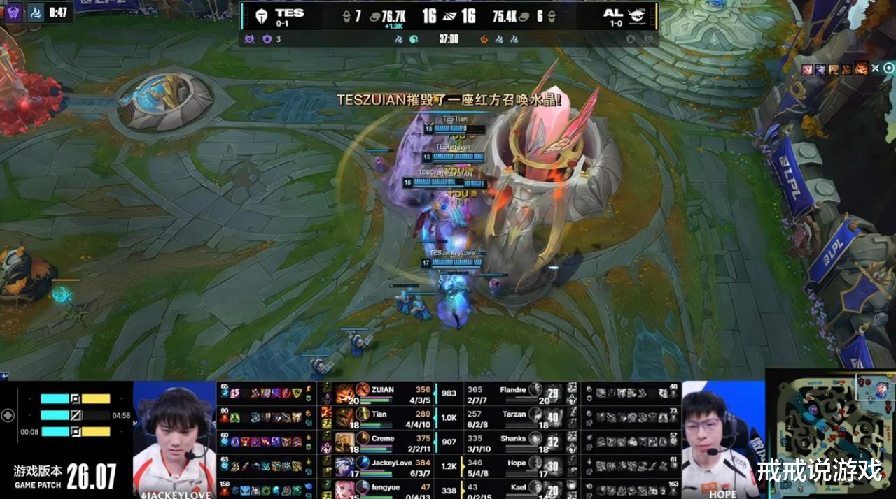 阿水这边也总算熬出头了,第一局前期打得一波三折,TES一度落后7.5K经济,但到了36分钟的中路团战,Tian皇子大招盖四个,JackeyLove艾希三杀收尾,TES团灭AL直接一波推平基地。阿水拿到复出后的第一个人头时,弹幕被舒服了三个字彻底刷屏,大家是真替他松了口气。