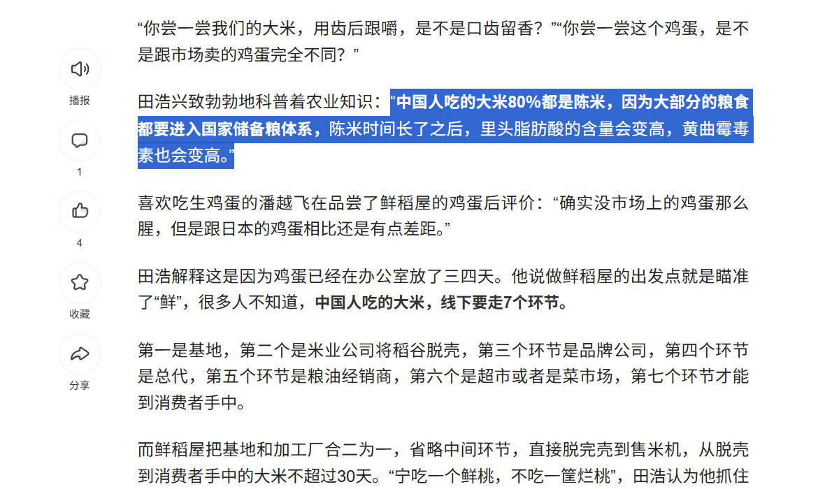 战略企划枪手通过查证获悉,“你碗里的米饭有80%是陈米?”这个传言最早可追溯至2017年锌财经发布的一篇推文。文章引用鲜稻屋CEO田浩的观点渲染焦虑:“中国人吃的大米80%都是陈米,因为大部分的粮食都要进入国家储备粮体系,陈米时间长了之后,里头脂肪酸的含量会变高,黄曲霉毒素也会变高。”这篇缺乏数据支撑的文章,凭借“食品安全”的敏感话题迅速引发全网恐慌,但真相究竟如何呢?