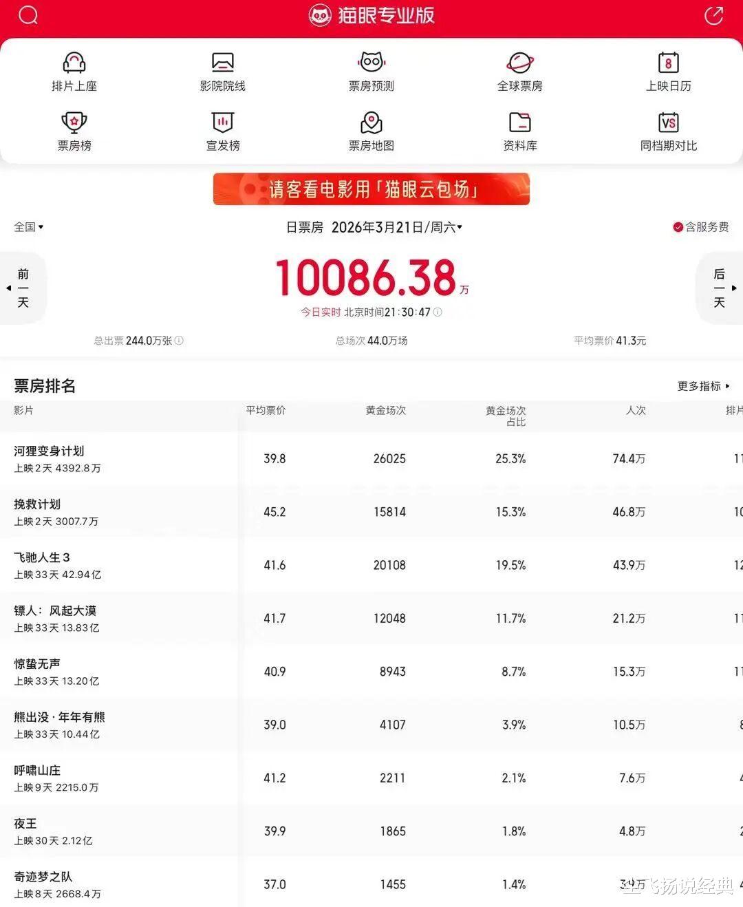 3月21日,周六,电影大盘勉强过1亿。