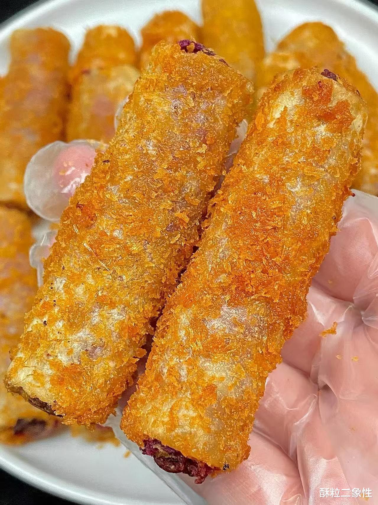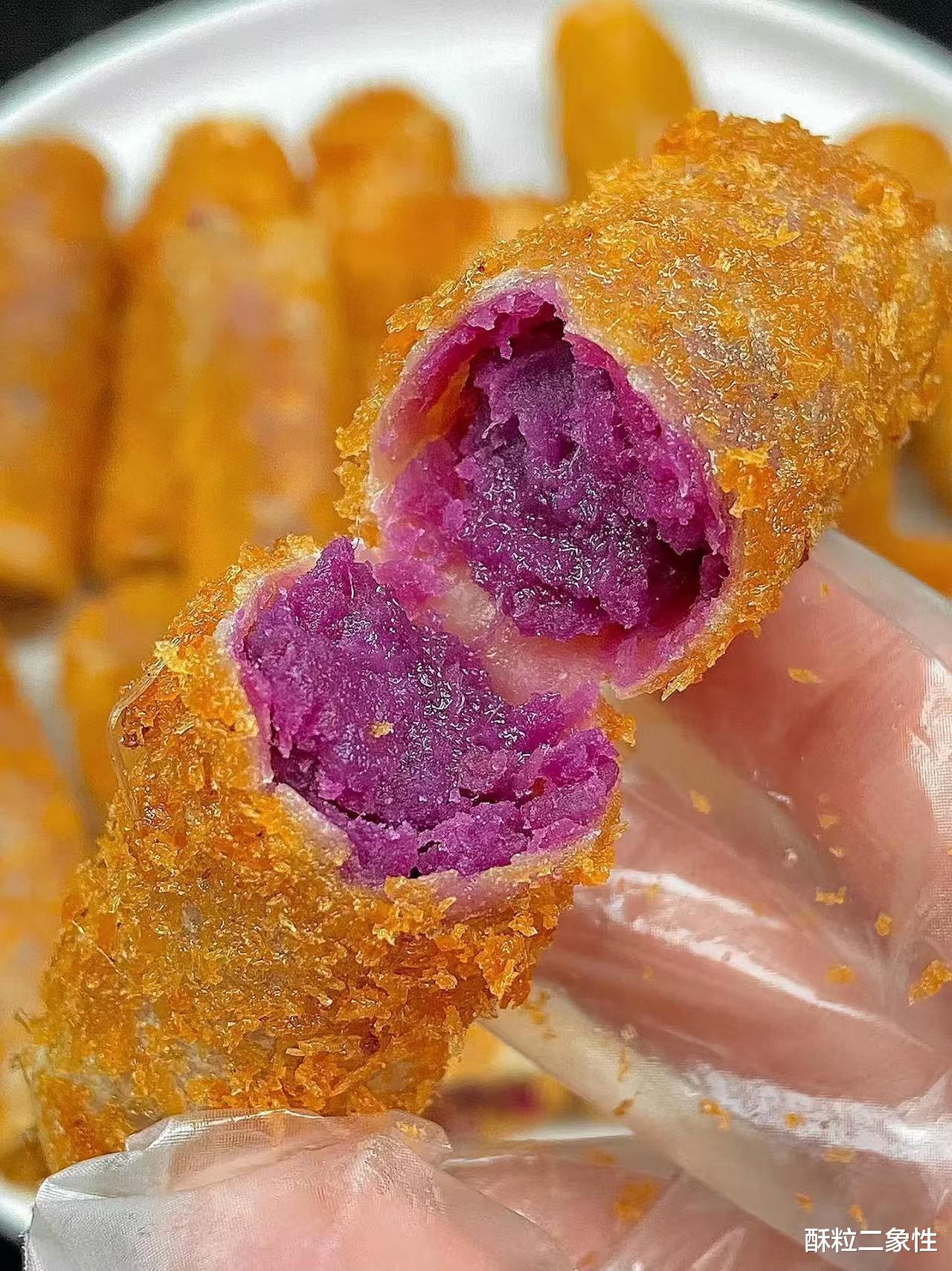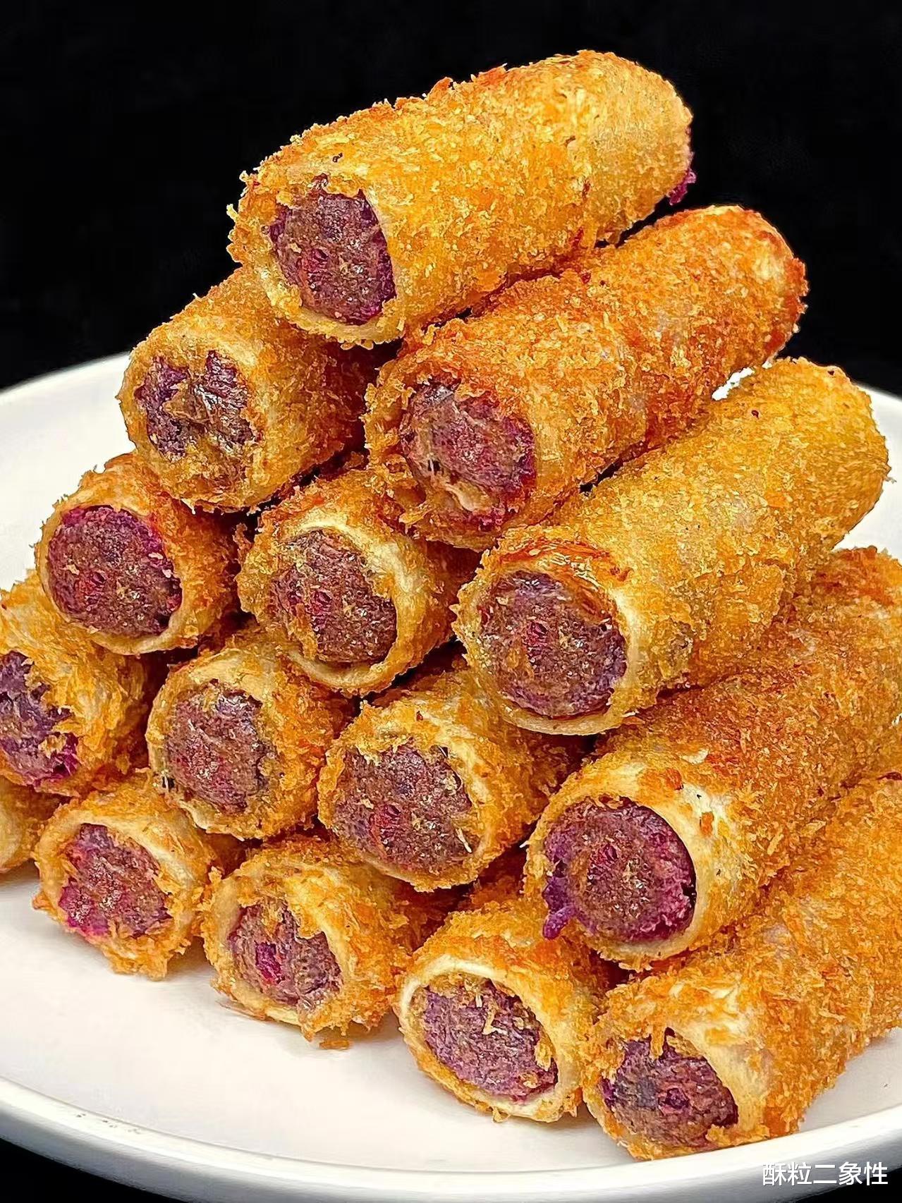刚出锅的酥香紫薯馄饨皮,外皮酥脆得掉渣,轻轻咬一口,里面的紫薯馅热乎乎、软糯糯的,香甜的气味在口腔里弥漫开来,那感觉,简直太满足了!而且,这道小吃冷了也好吃,外皮变得稍微硬一点,但里面的紫薯馅依然保持着软糯的口感,别有一番风味。