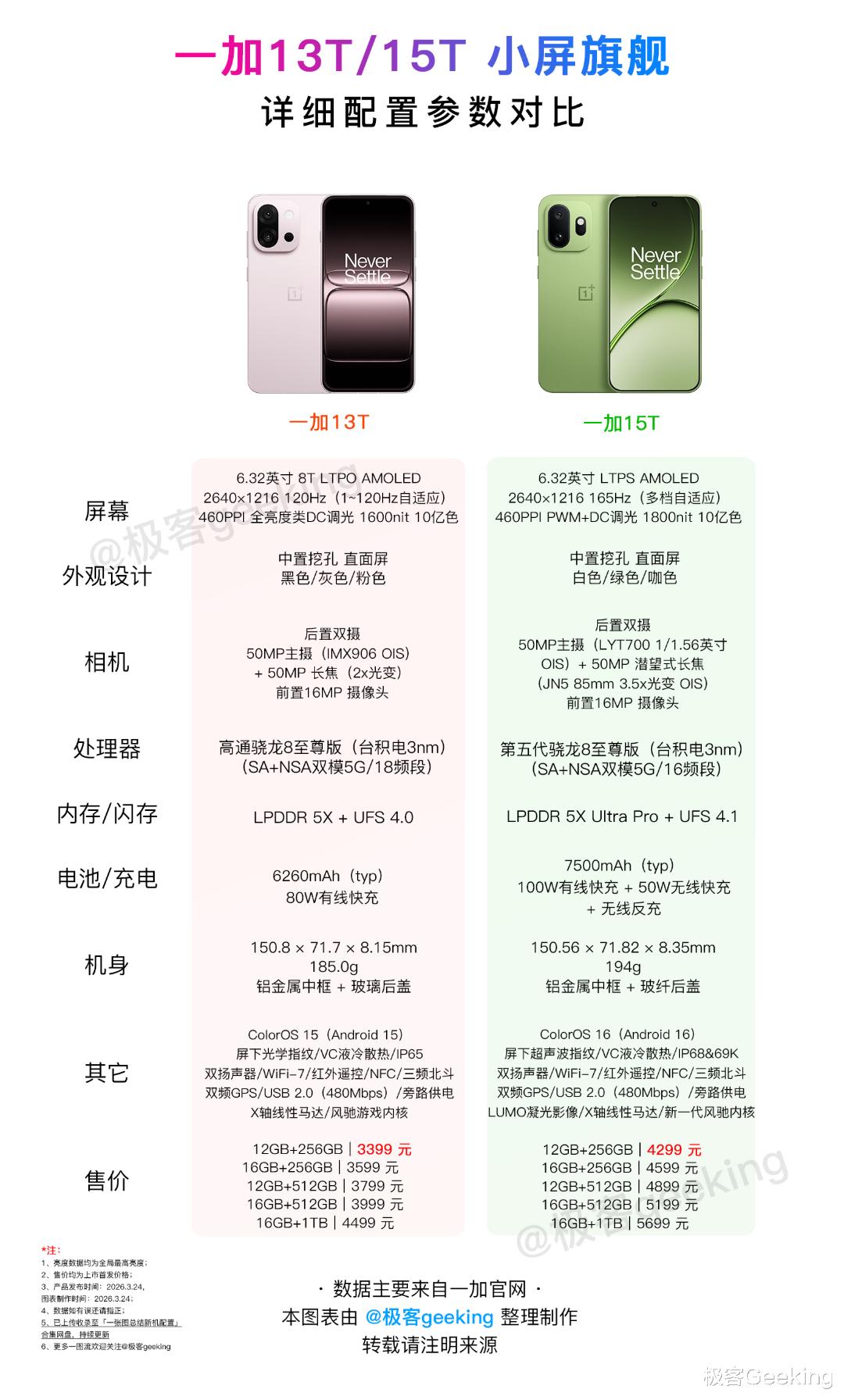 依然惯例,这次极客君同样带来了新款旗舰手机的「一图完全总结新机」,一张图带你详细了解一加15T/13T 两代小屏旗舰的配置参数完全对比!