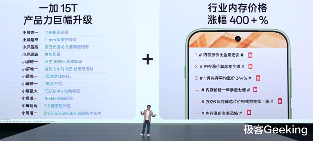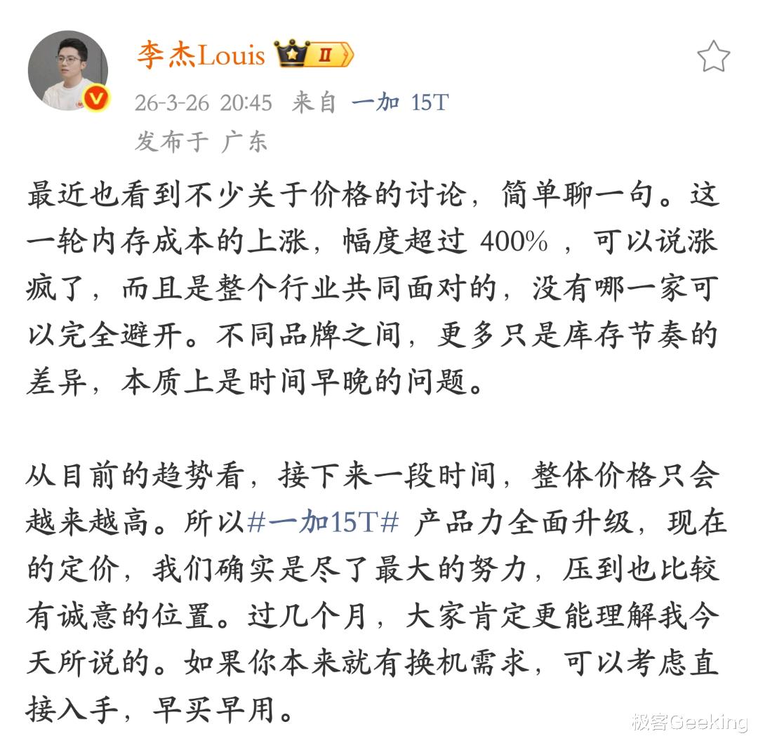 关于一加15T 涨价起售价格达 4299 元的讨论,一加总裁李杰在个人社交媒体给出回应,称这一轮内存成本上涨幅度超过 400% ,这是整个手机行业都要面对的,不同品牌之间涨价也只是时间早晚的问题,趋势就是行业整体价格只会越来越高。