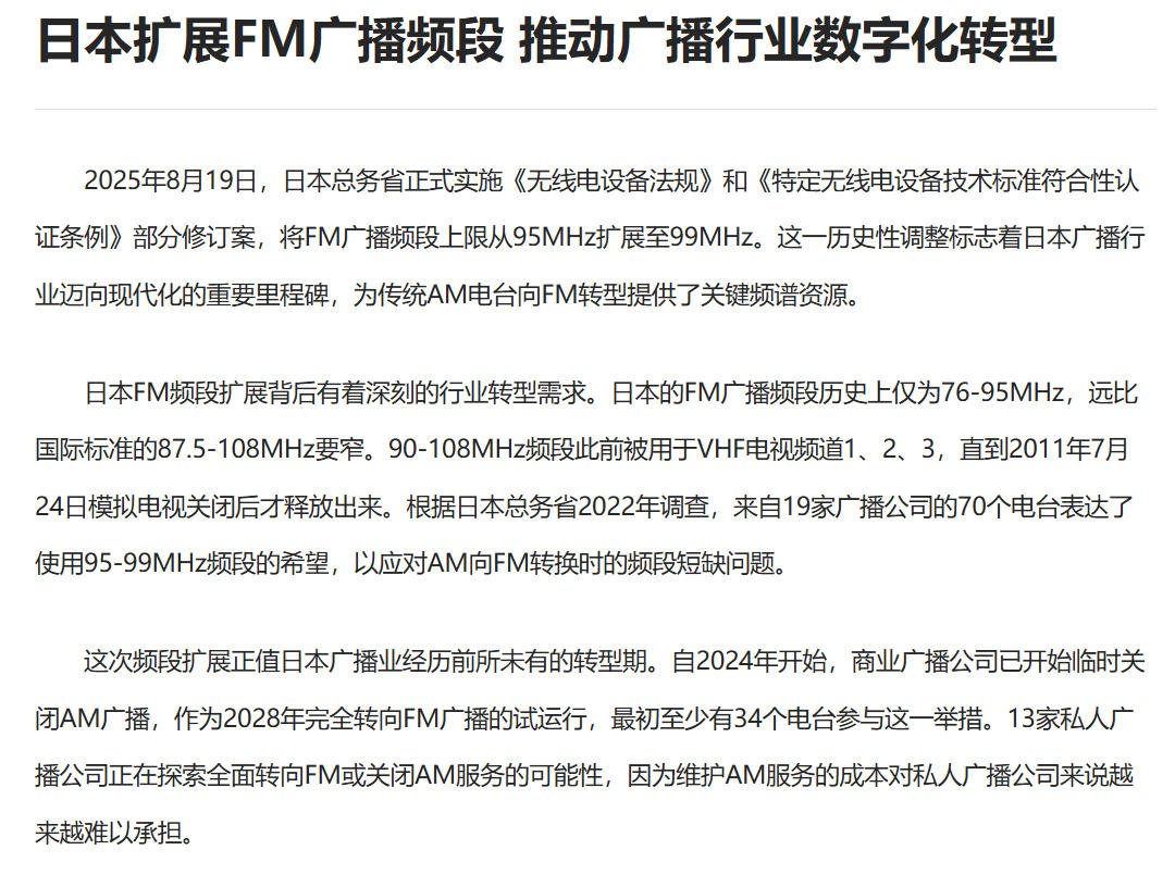 新释放的频谱,为这场“搬家”提供了目的地,减少了与现有FM电台的冲突。日本总务省已明确,不强制现有电台改频,保证了市场稳定;但新设或采购设备必须符合新标准,为未来划定了跑道。