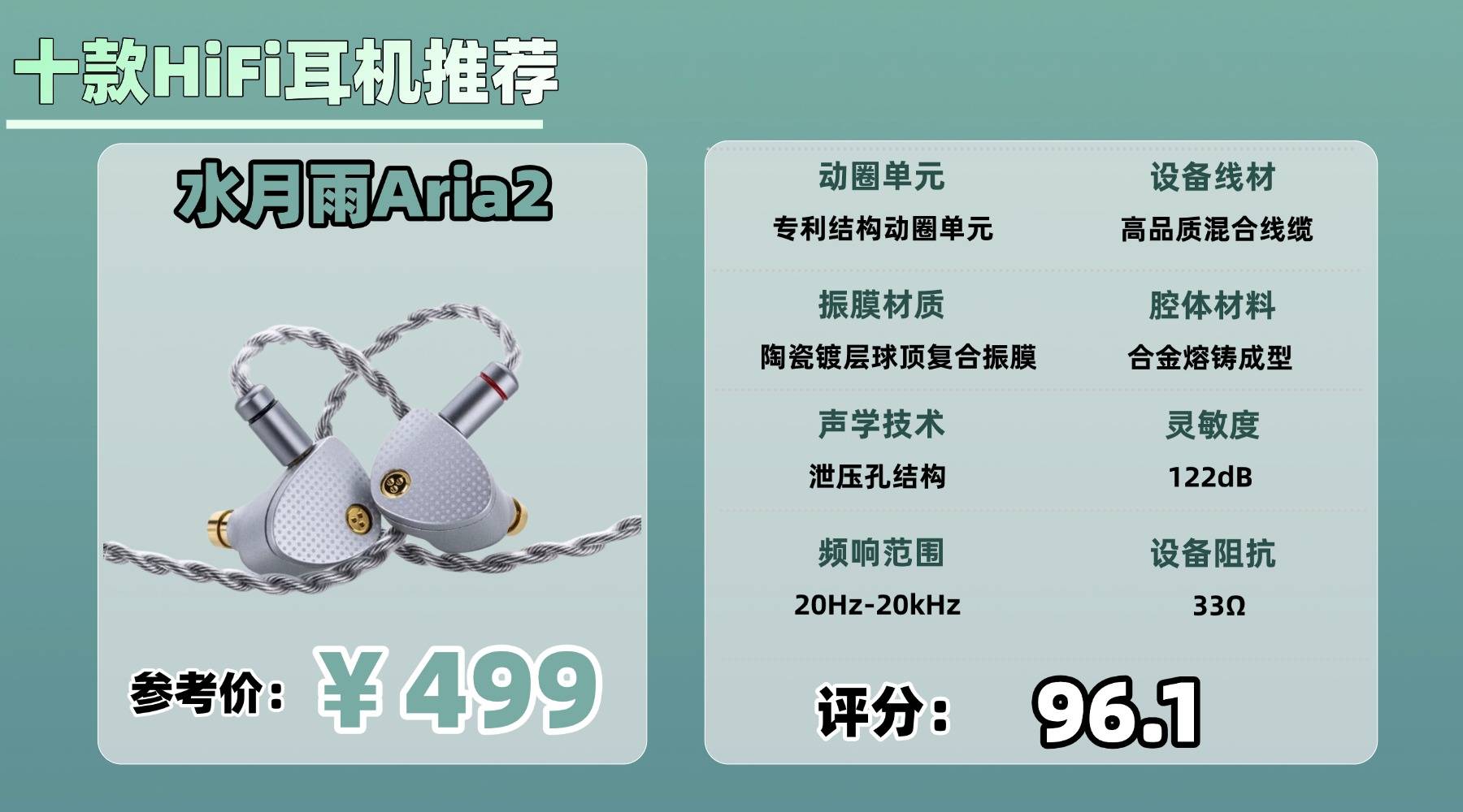 Ar ia 2 延续水月雨一贯的耐听调校风格。腔体采用合金熔铸工艺,内部搭载专利动圈单元与复合磁路,振膜为陶瓷镀层复合材质,整体声音温润自然。中频厚度适中,人声位置靠后,听感松弛不紧绷,高频延展顺滑、刺激感低;低频弹性保留得较克制,更强调自然衔接而非堆积量感。