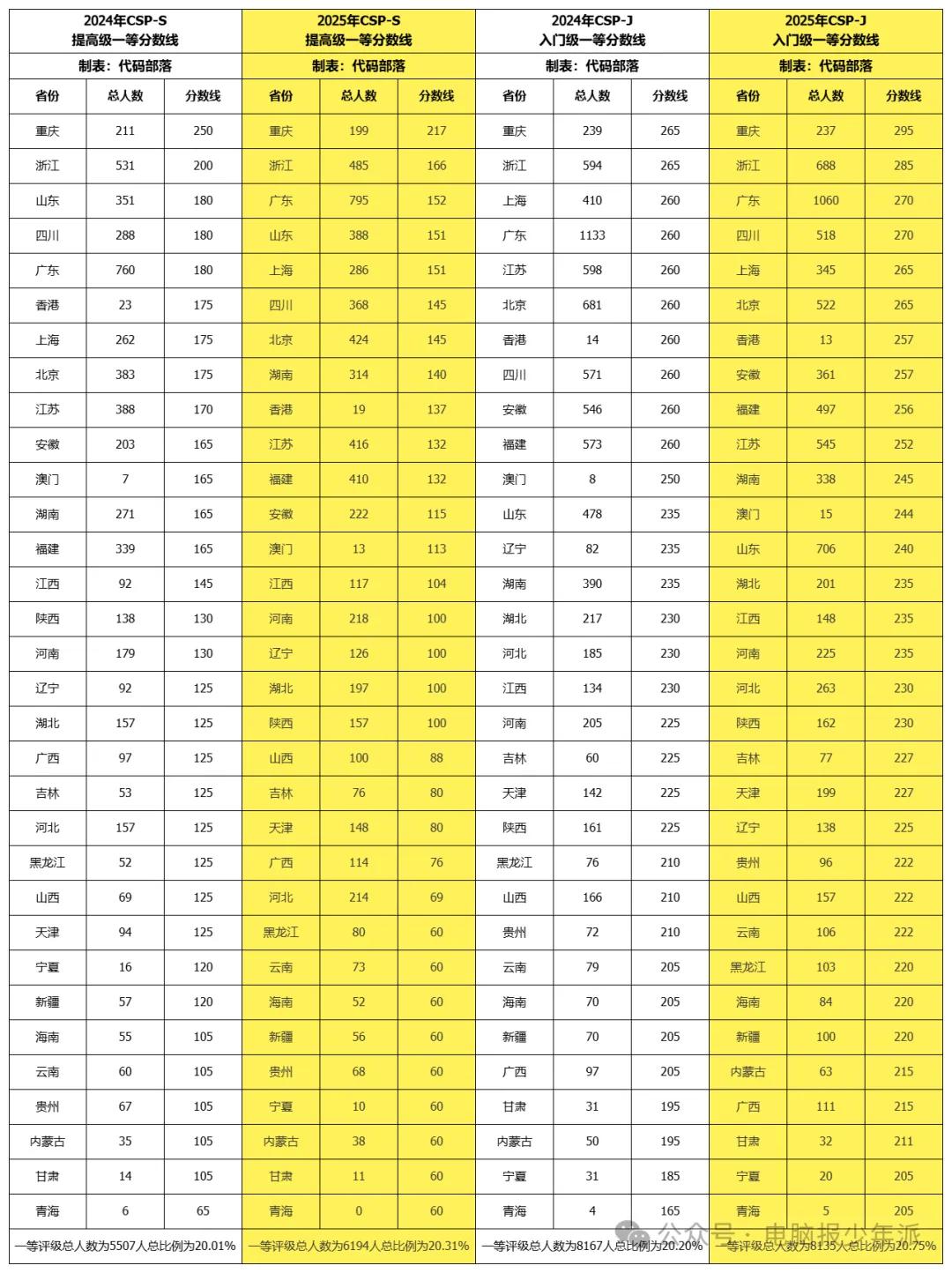 2025年CSP-J/S第二轮认证结果近日公布。根据数据,全国范围内信息学竞赛的竞争正变得越来越激烈。今年提高组一等奖分数线最高的重庆达到217分,远超全国基准线131分;入门组一等奖分数线最高的重庆更是高达295分。