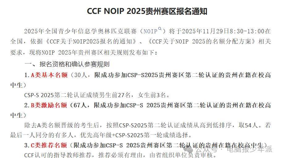初中生体验名额是其中之一。在NOIP2025贵州赛区,专门设置了E类初中生体验名额。这类名额针对成功参加CSP-S 2025贵州赛区第二轮认证的贵州在籍在校初中学生。