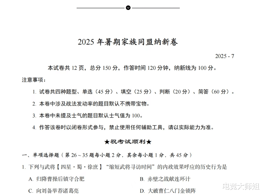仔细一看这个试卷,还真不是那种用简单常识题糊弄人搞噱头的,里面竟然涵盖了人文历史、战术谋略、游戏知识、资源分配、数学计算等多个维度,这些题考完感觉自己都要长脑子了,我现在颇有当世孔明之姿。